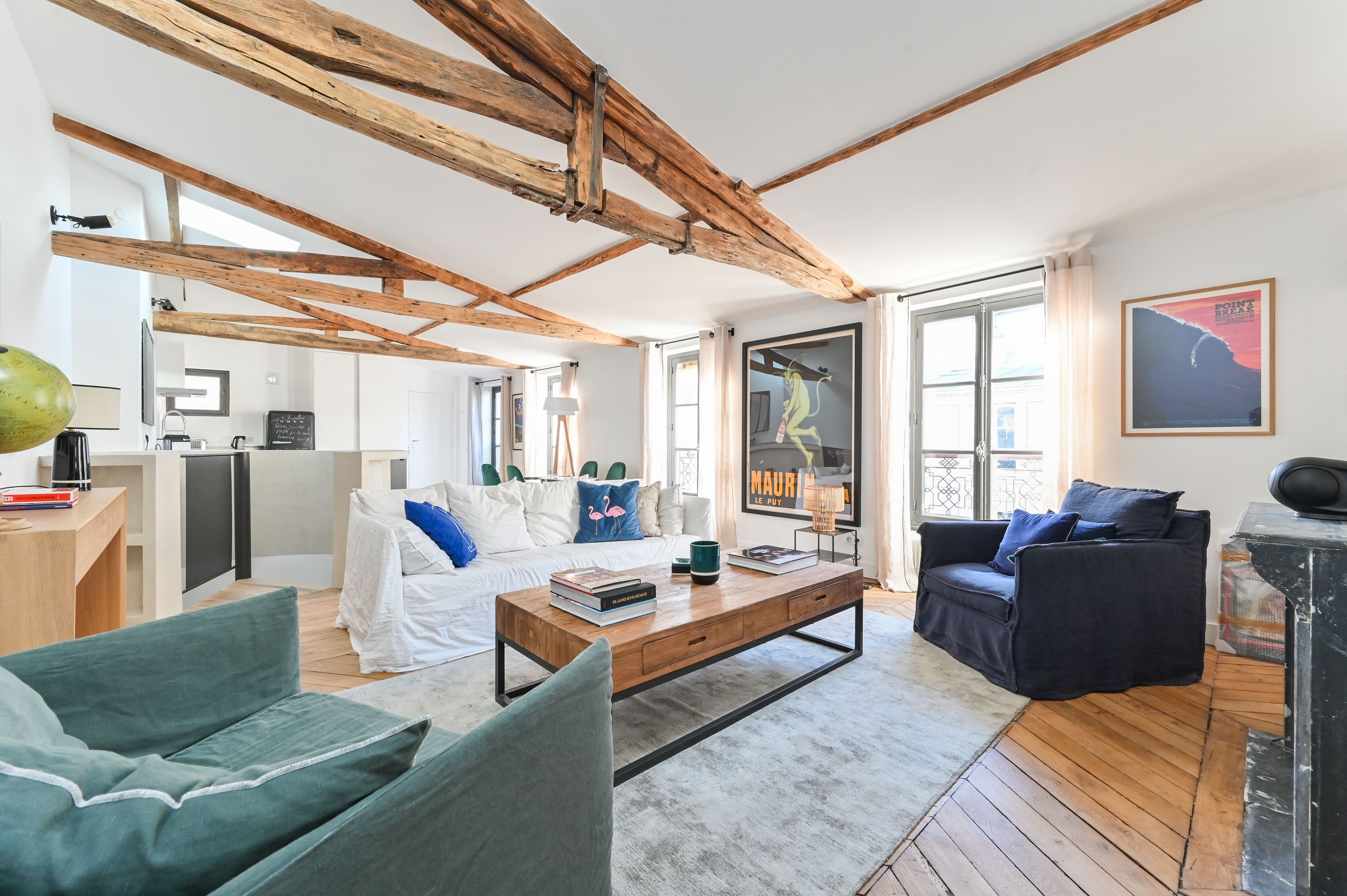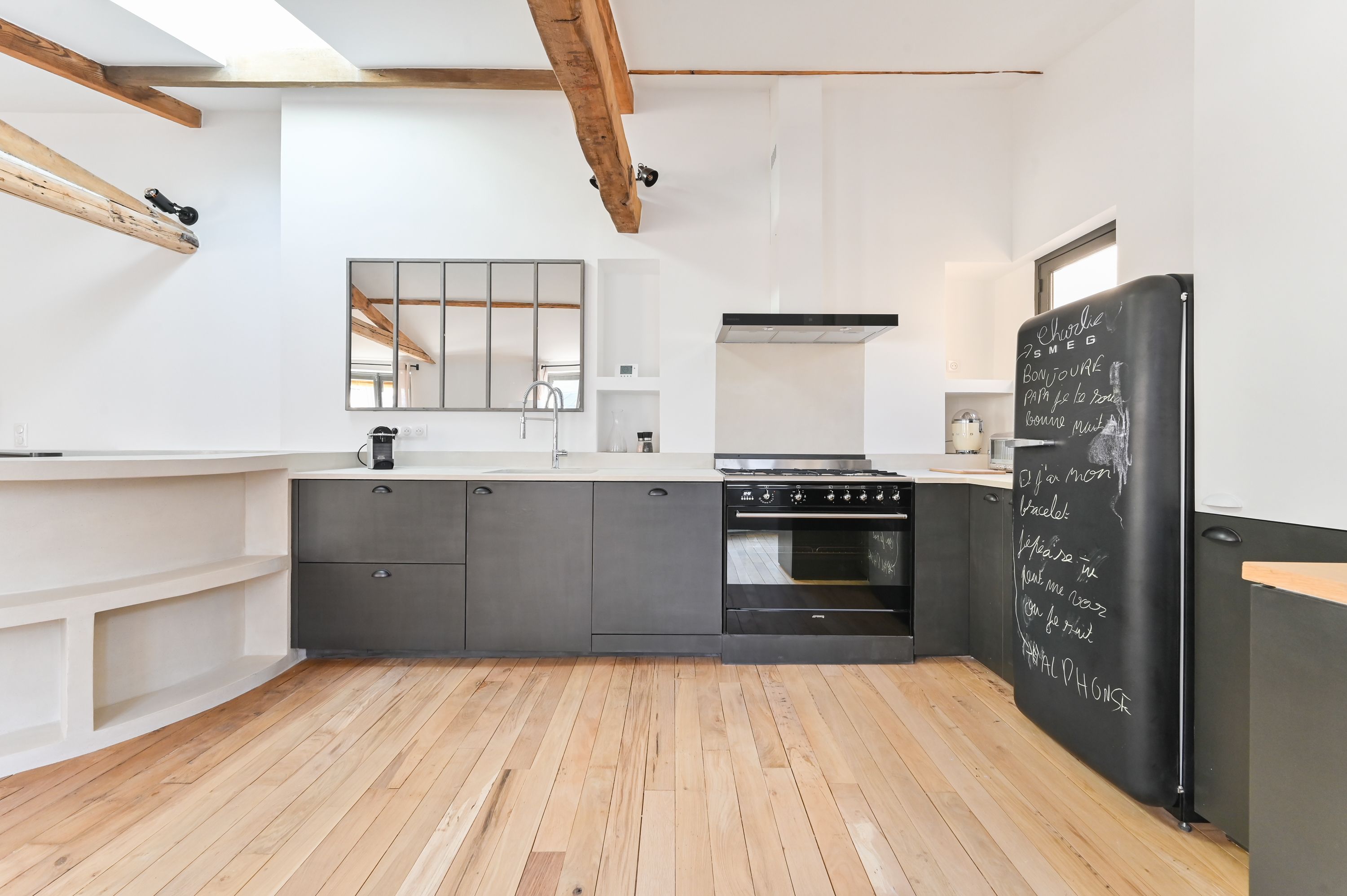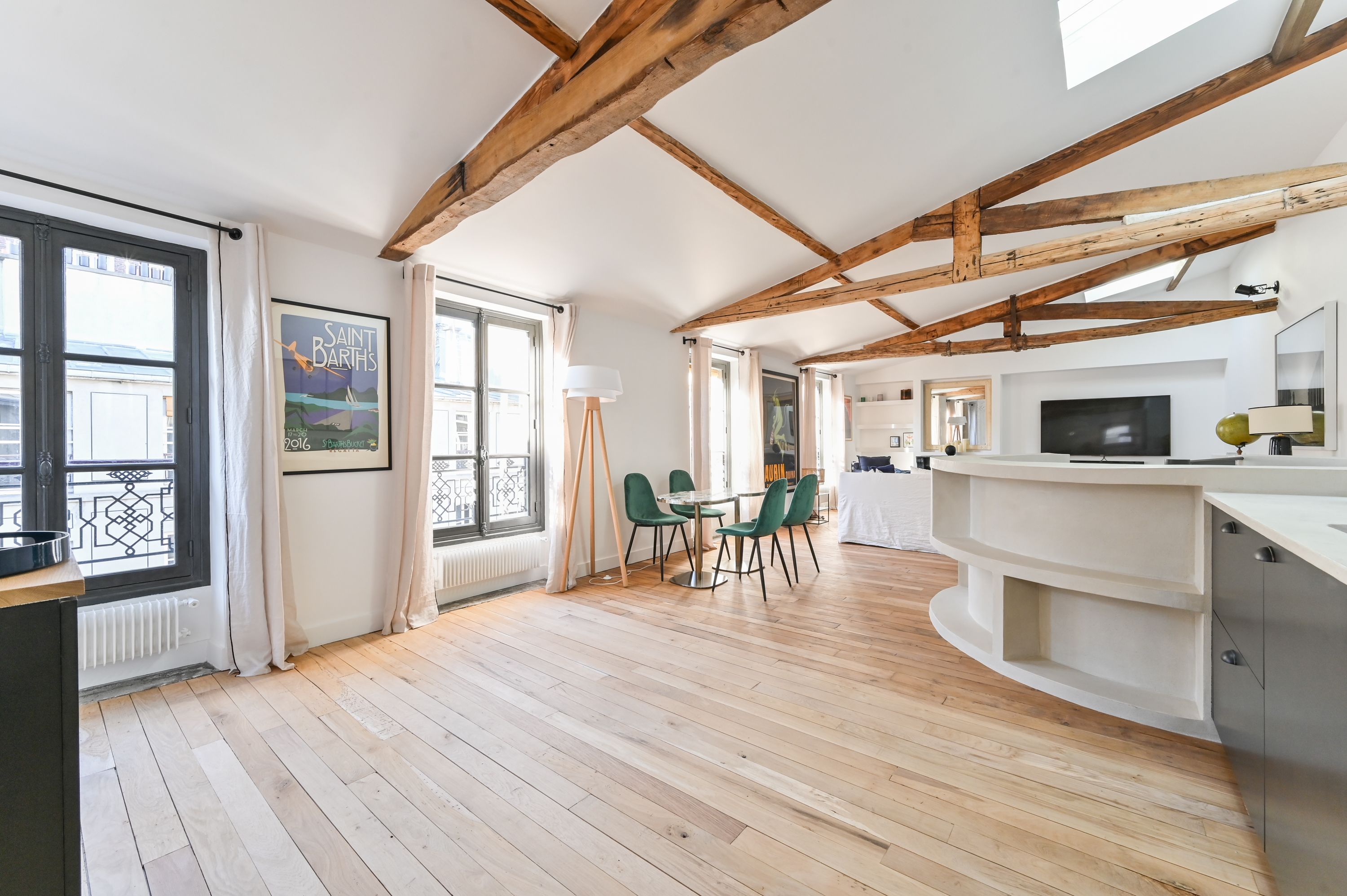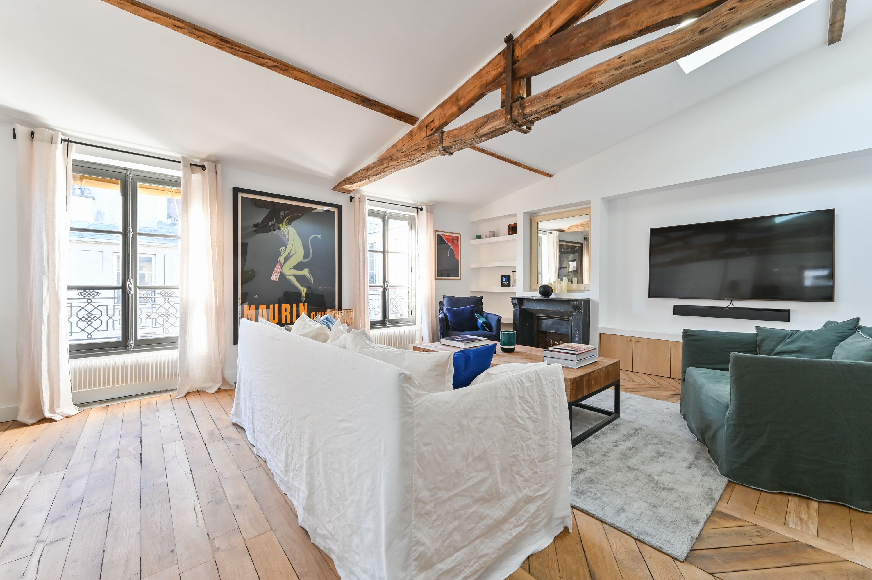 Immeuble ancien des années 1850, idéalement situé dans une rue prestigieuse de Paris à proximité des Invalides et de la rue Saint-Dominique, appartement en duplex de 93,50m² loi Carrez, au dernier étage desservi par ascenseur, au calme sur grande cour, bénéficiant d'une très belle luminosité, d'un plan sans perte de place, ainsi que du charme de l'ancien (parquet, cheminées), entièrement refait par un décorateur d'intérieur. Au niveau supérieur : entrée sur vaste pièce de réception dotée de 3 fenêtres, cuisine ouverte entièrement équipée et aménagée. Au niveau inférieur : 2 belles suites parentales avec salle de douche dont une avec toilettes, toilettes séparées, rangements. 2 caves.
