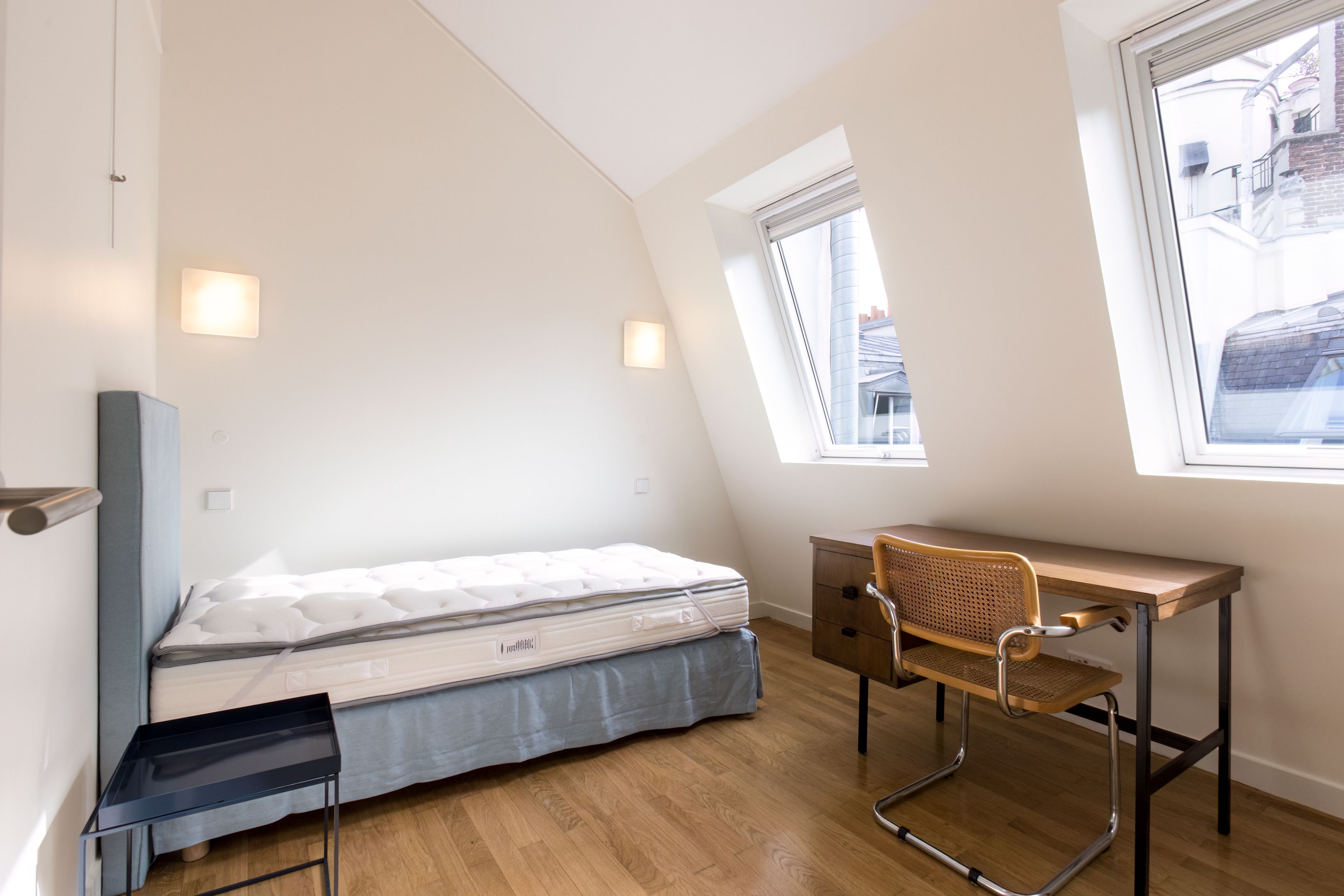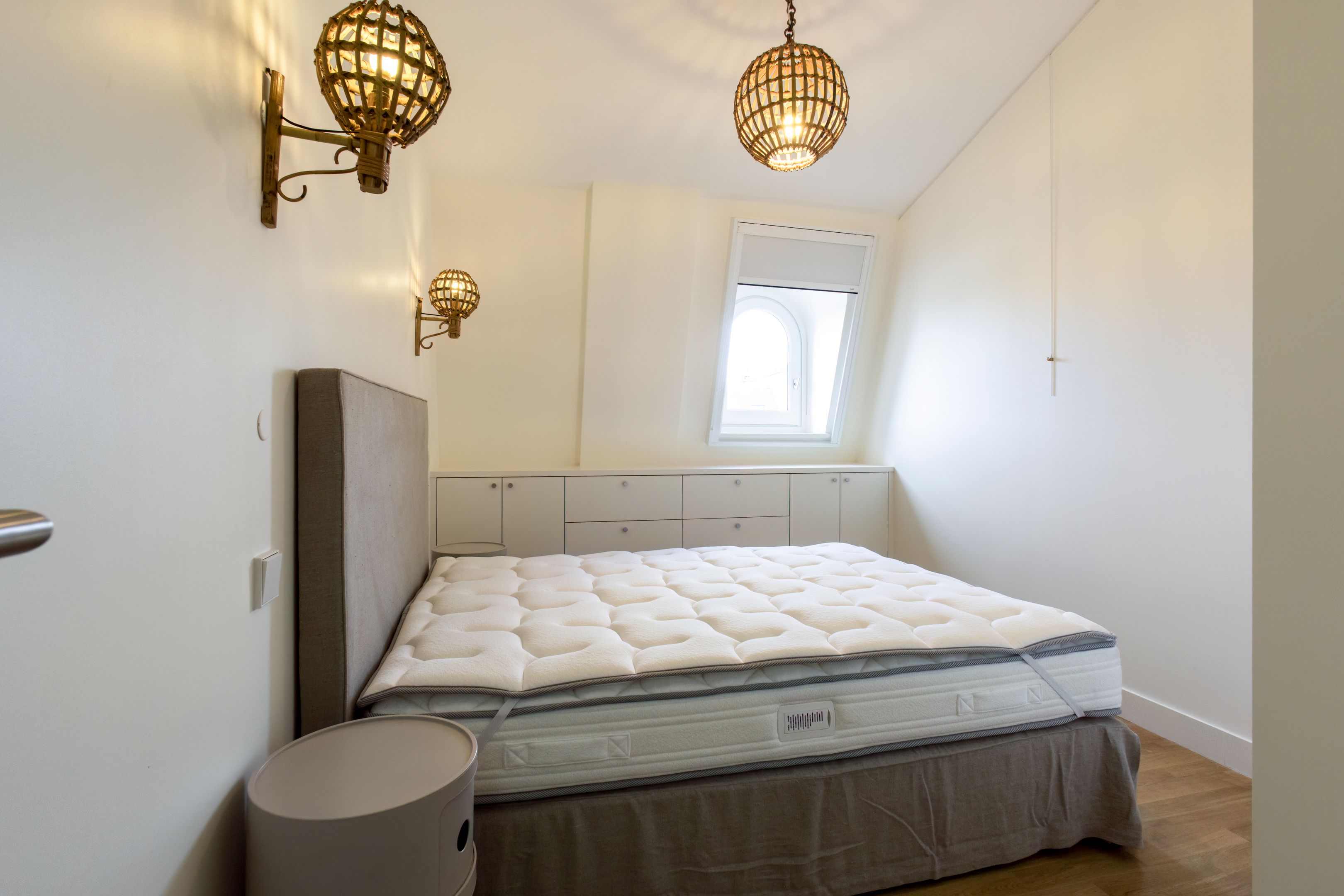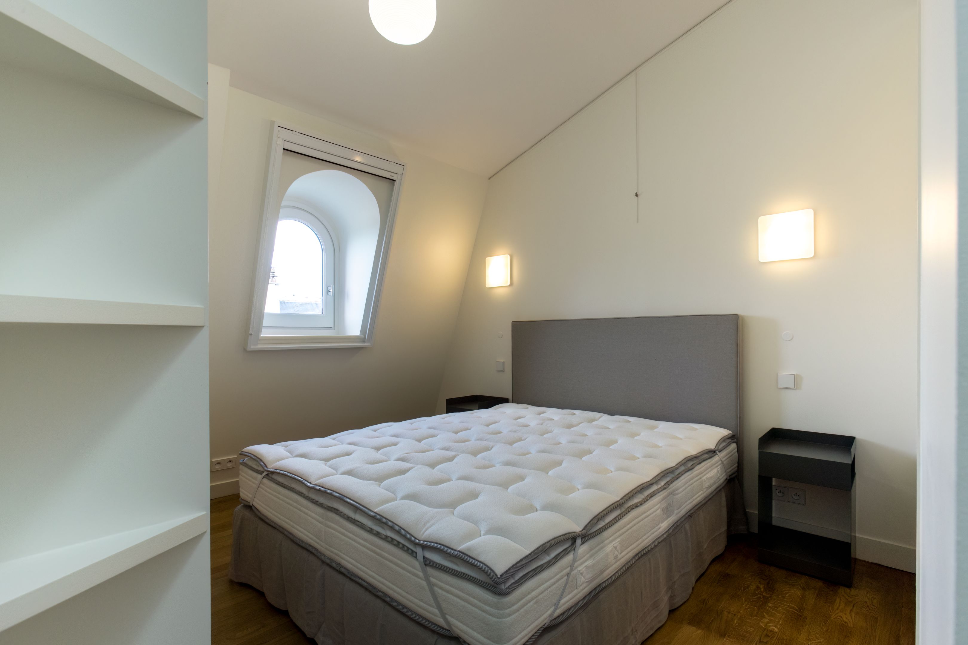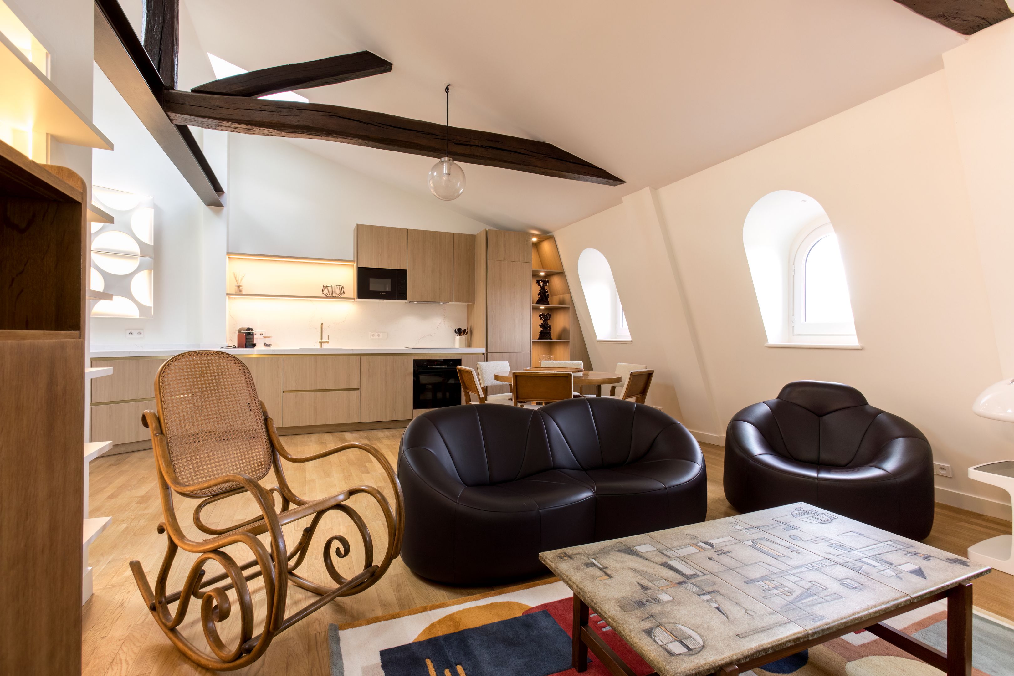 Immeuble ancien bien entretenu, très bel appartement entièrement rénové de 93 m² (83 m² Loi Carrez), au sixième et dernier étage, desservi par ascenseur. Entrée avec placards, séjour avec cuisine ouverte aménagée et équipée, dégagement avec placards (espace buanderie), trois chambres avec placards (dont chambre parentale avec salle d'eau et toilettes), salle d'eau et toilettes séparées. Très belles prestations : climatisation, double vitrage, Velux motorisés... Résidence avec services inclus : internet (box), ménage (1 h/semaine), alarme, coffre. Disponible immédiatement.