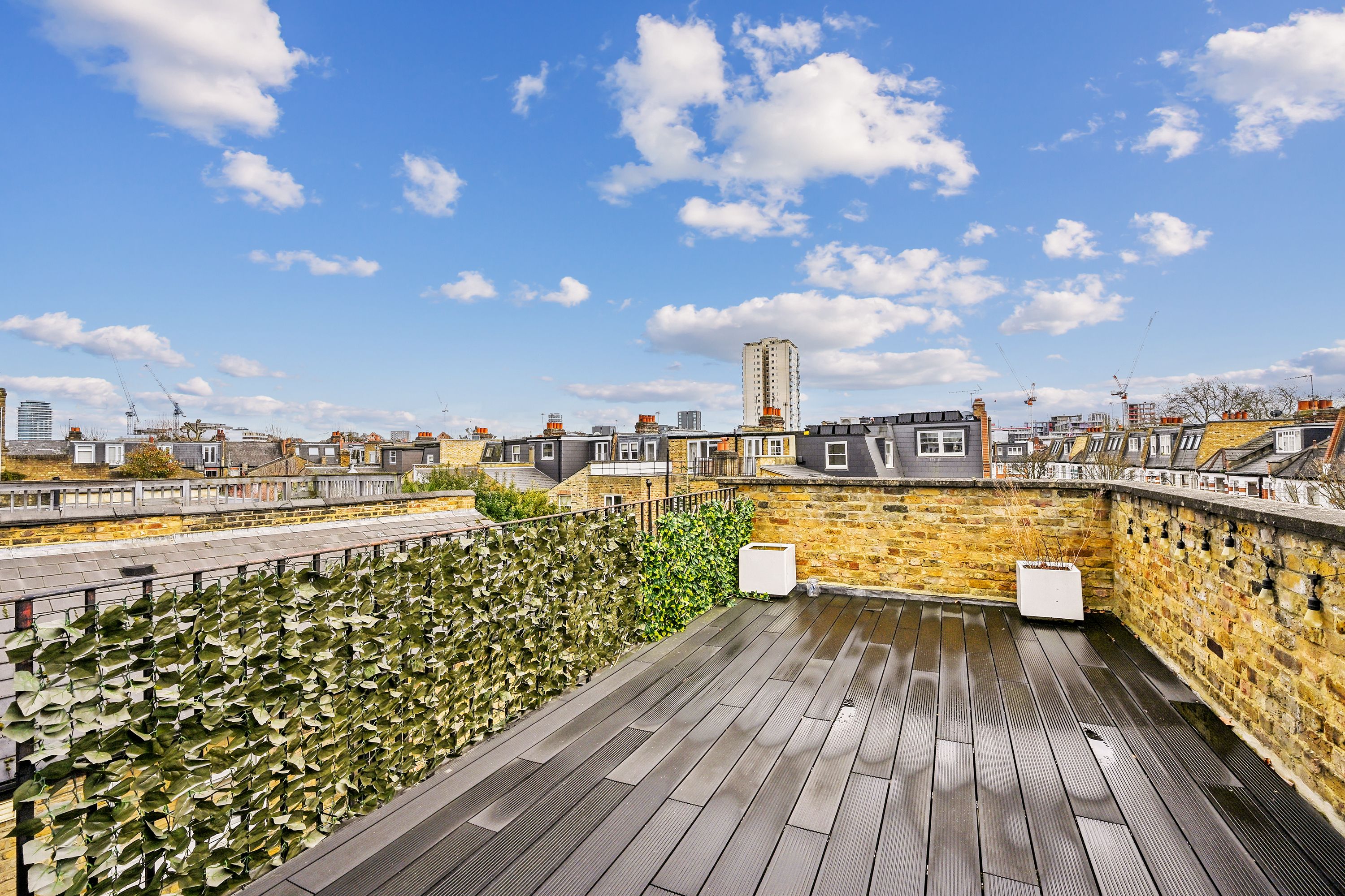 This property, located at the end of Narborough Street next to Settrington Road, enjoys a prime position. As an end-of-terrace house, it features bright rooms throughout. The ground floor offers a spacious front reception room with a large bay window, a ceiling rose, and wood flooring. This leads to a versatile room with ample storage, suitable as a second reception room or dining area. The rear hosts a modern kitchen with integrated Miele and Smeg appliances and dining space, along with a separate utility room. Bi-fold doors open to a south-facing garden with artificial grass, perfect for al fresco dining, with street access for bikes and scooters. The first floor has three double bedrooms, one en suite, all with fitted wardrobes, a family bathroom, and a study. The second floor comprises two more double bedrooms and another bathroom.