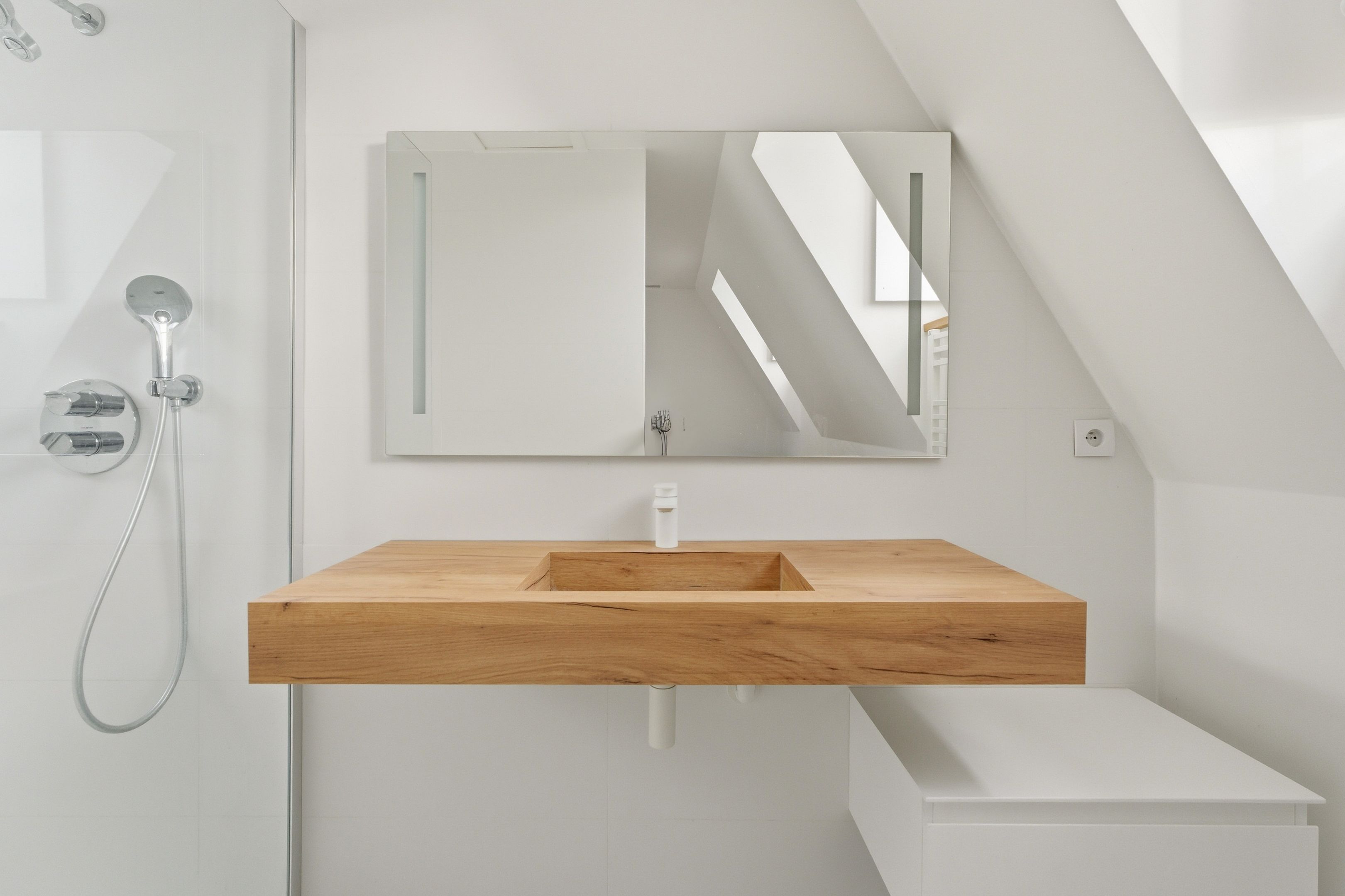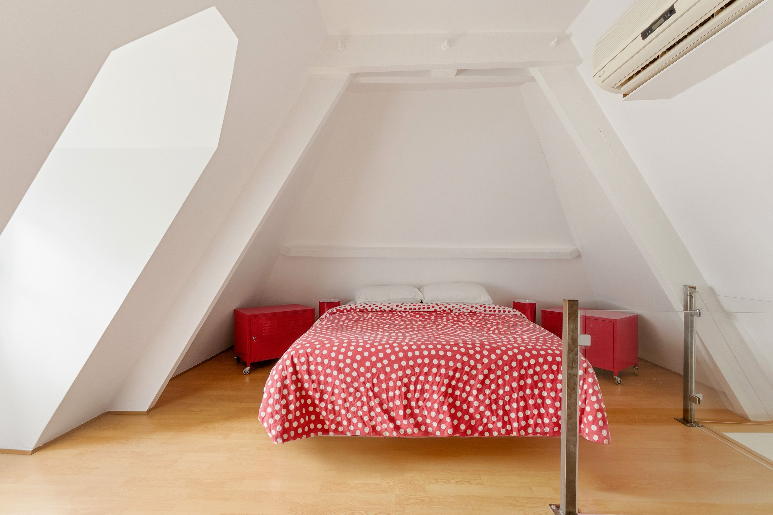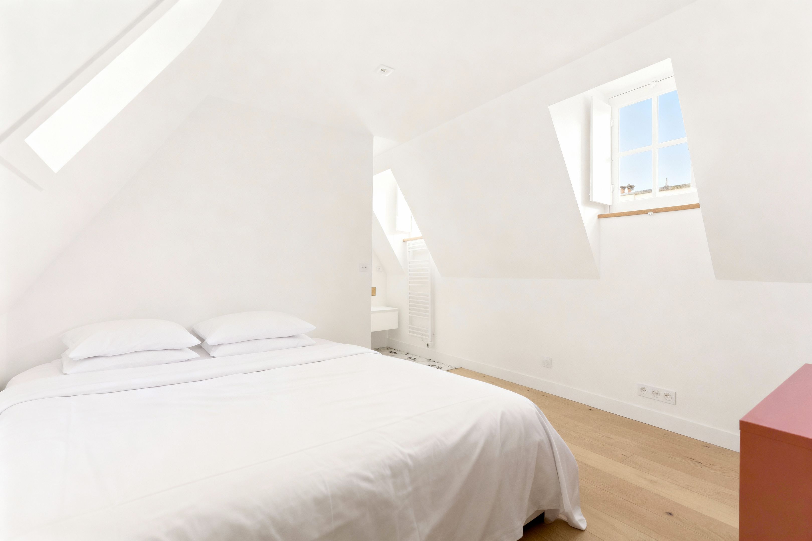 Au dernier niveau, la mezzanine accueille un beau coin nuit avec rangements intégrés.