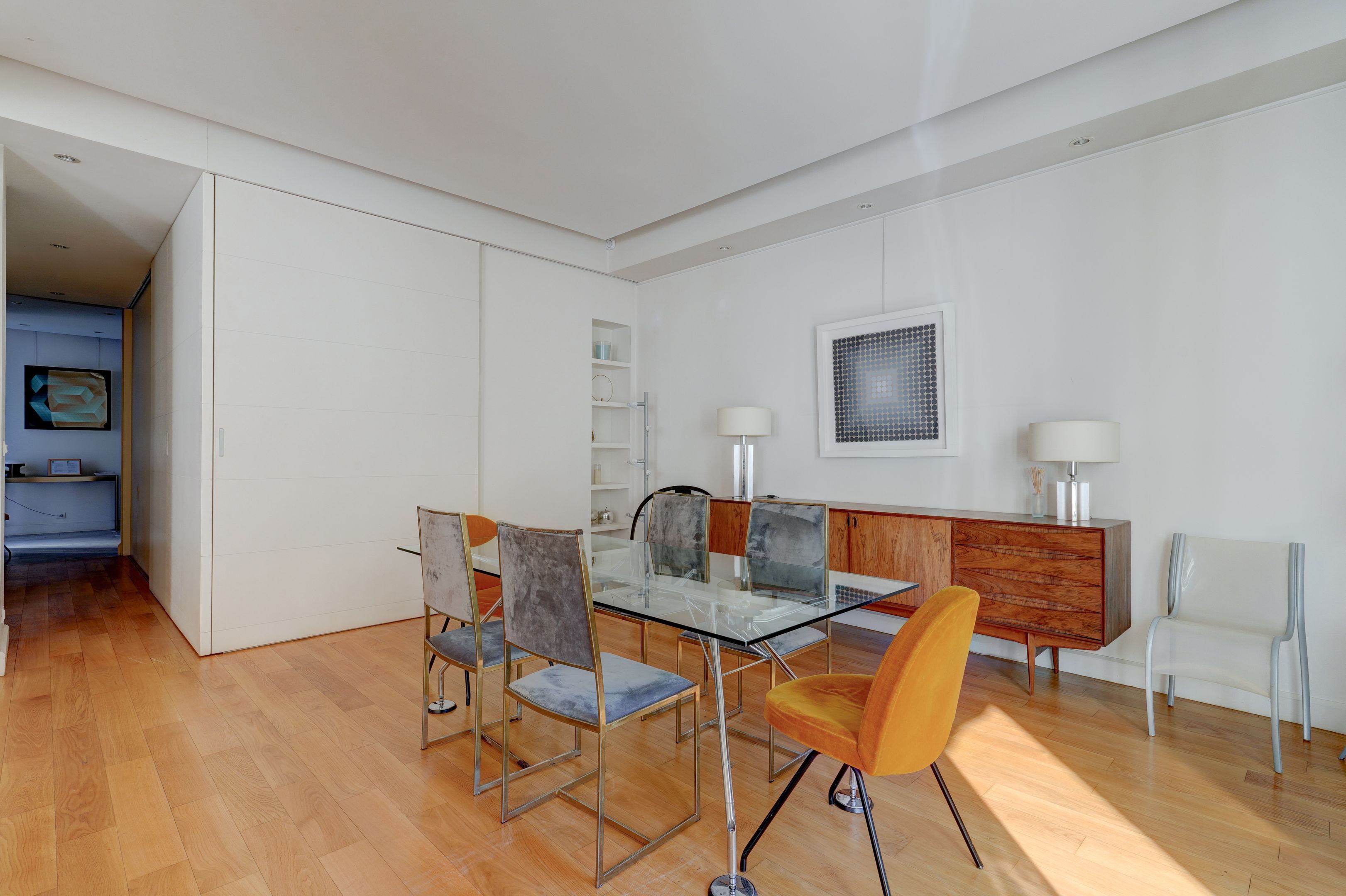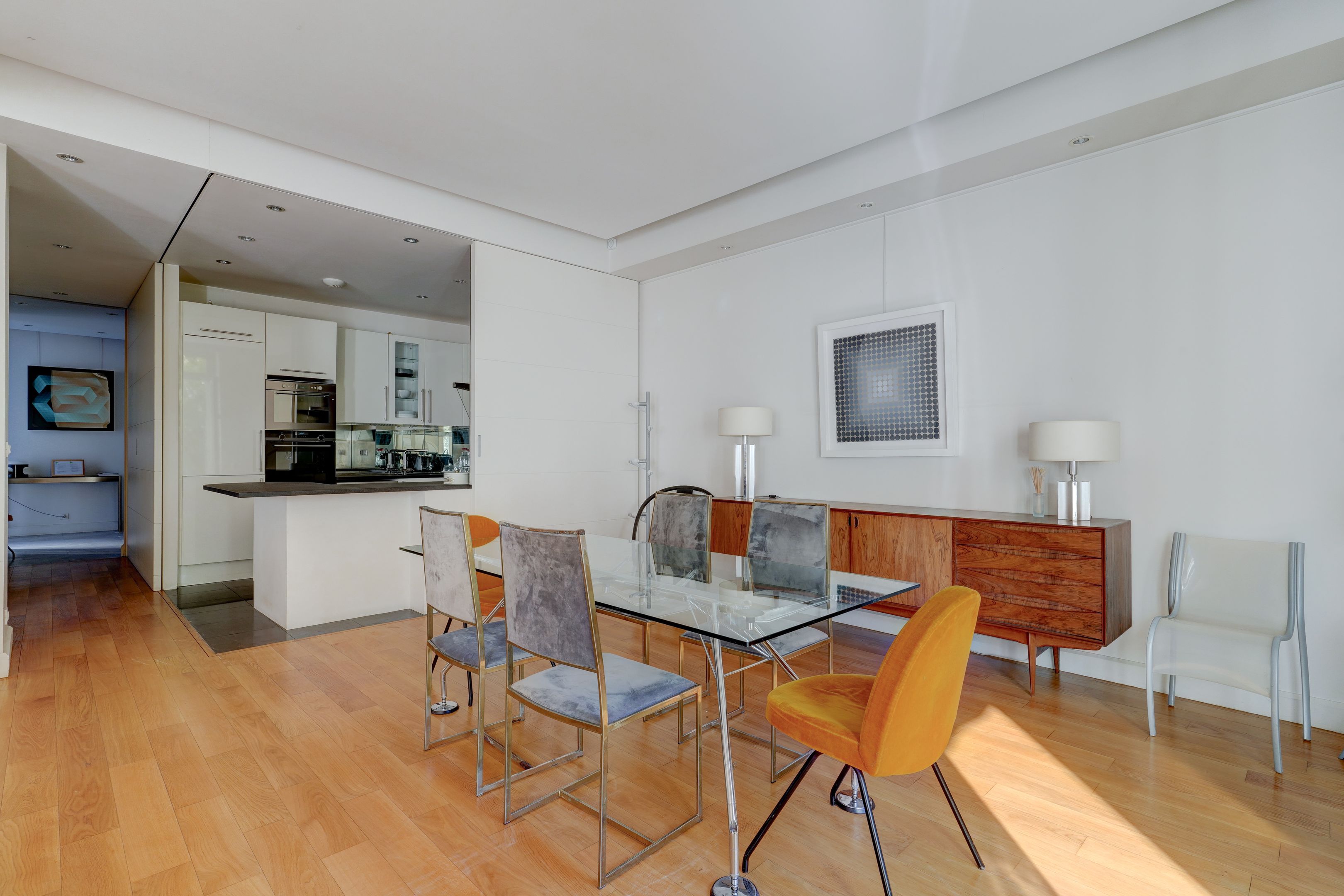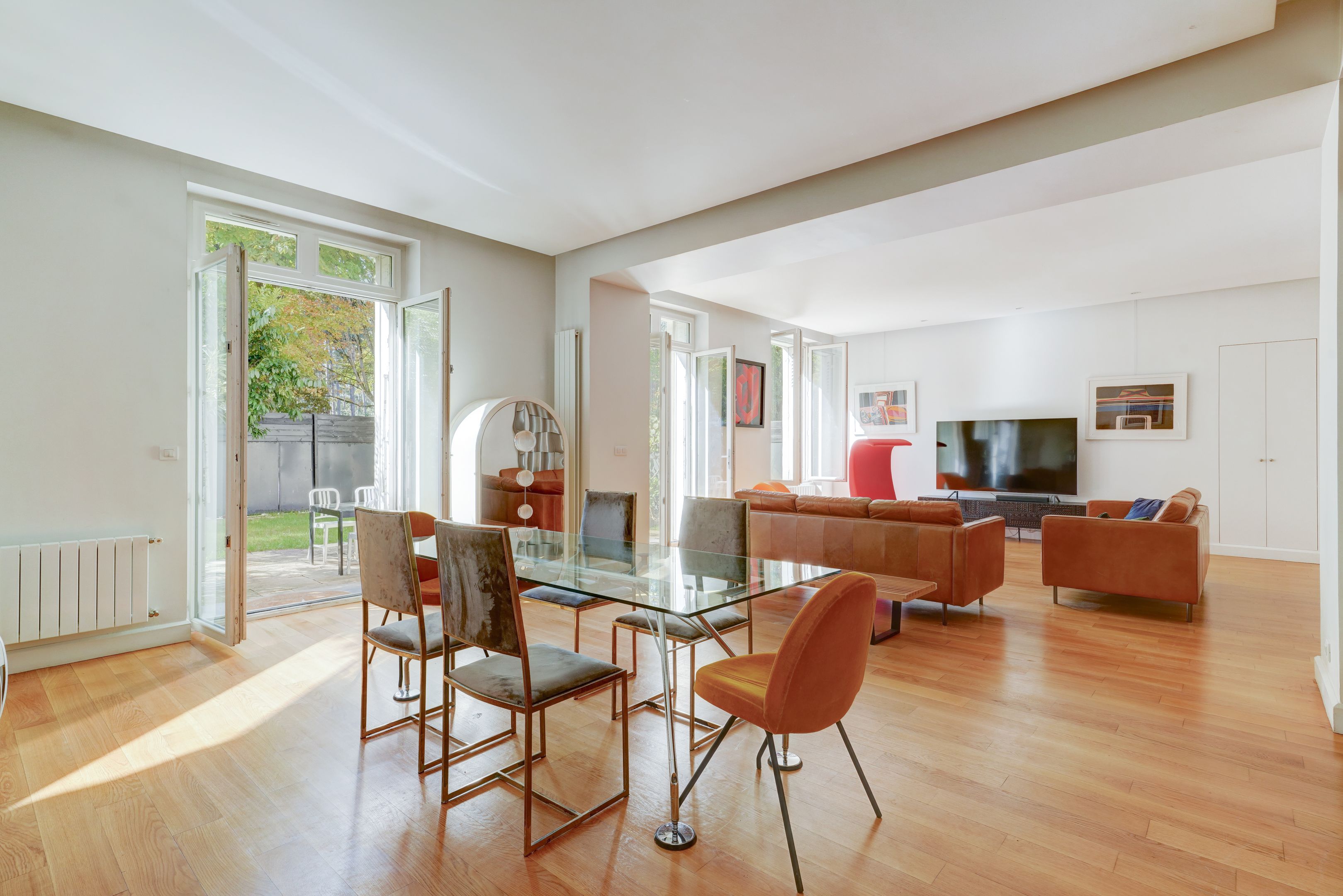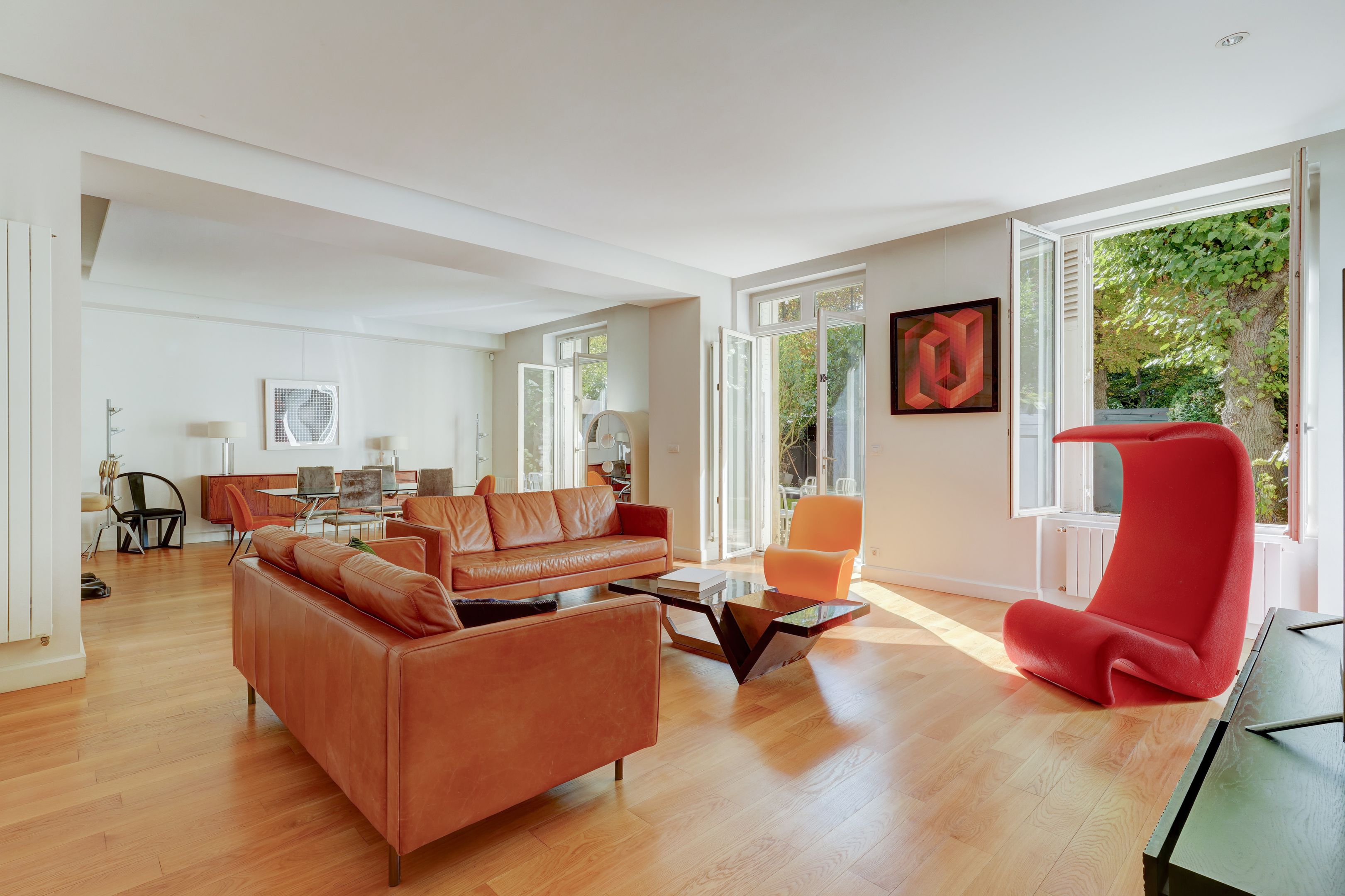 Immeuble en pierre de taille, avec digicode et gardien, faisant face au Bois de Boulogne, appartement de 130 m² habitables + sous-sol, en rez-de-jardin, bénéficiant d'un grand jardin exposé Sud et d'un un autre au Nord. Entrée avec vestiaire, salon et salle à manger accédant à l'espace extérieur, cuisine aménagée et équipée, dégagement menant à deux chambres (dont une avec salle d'eau) équipées de placards, à une salle de bains, et à des toilettes séparées.