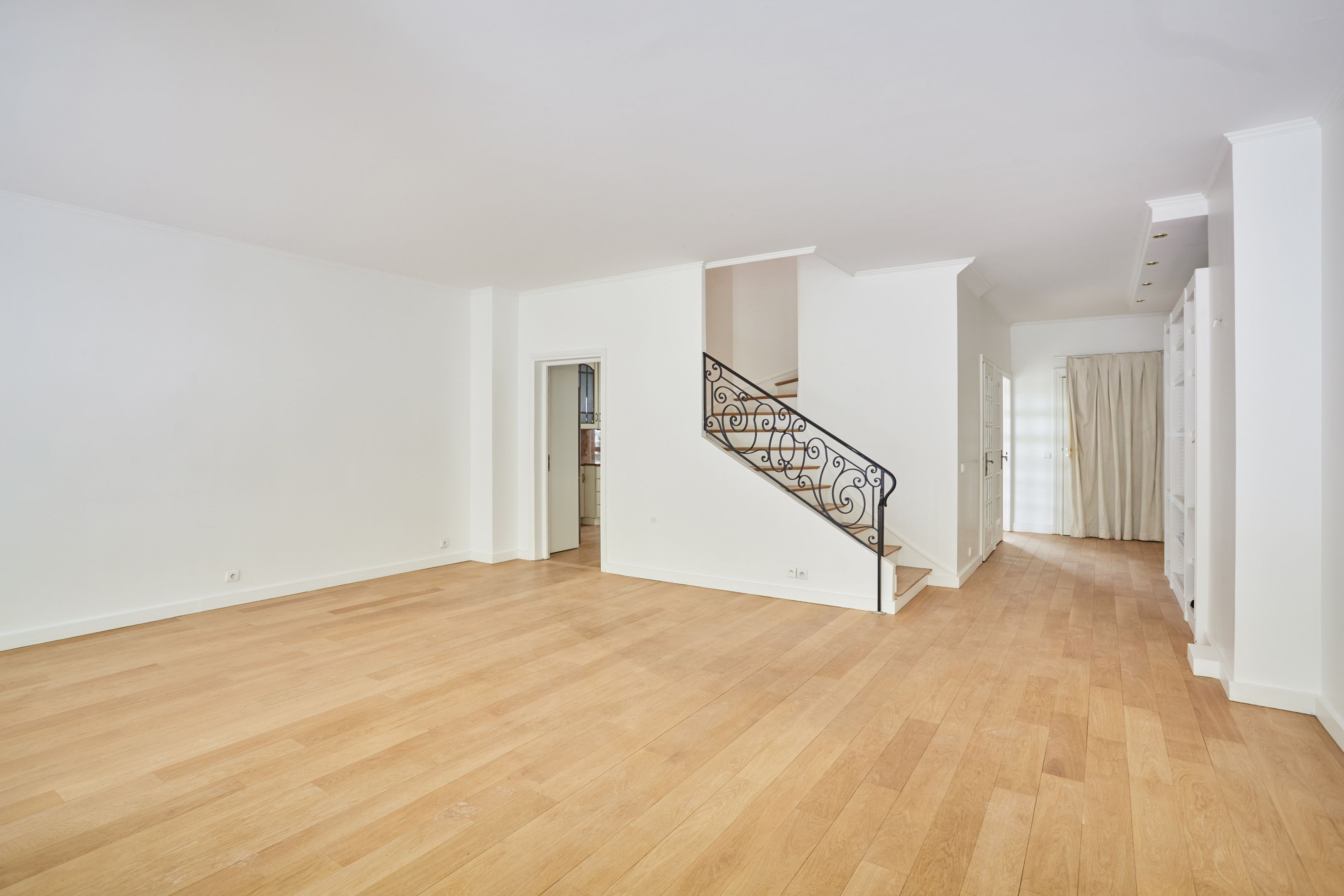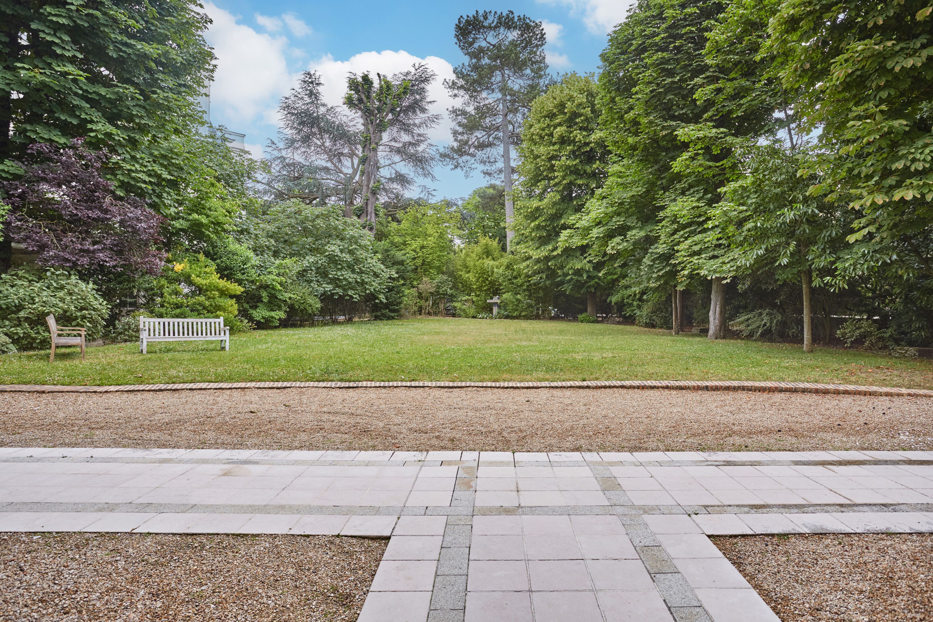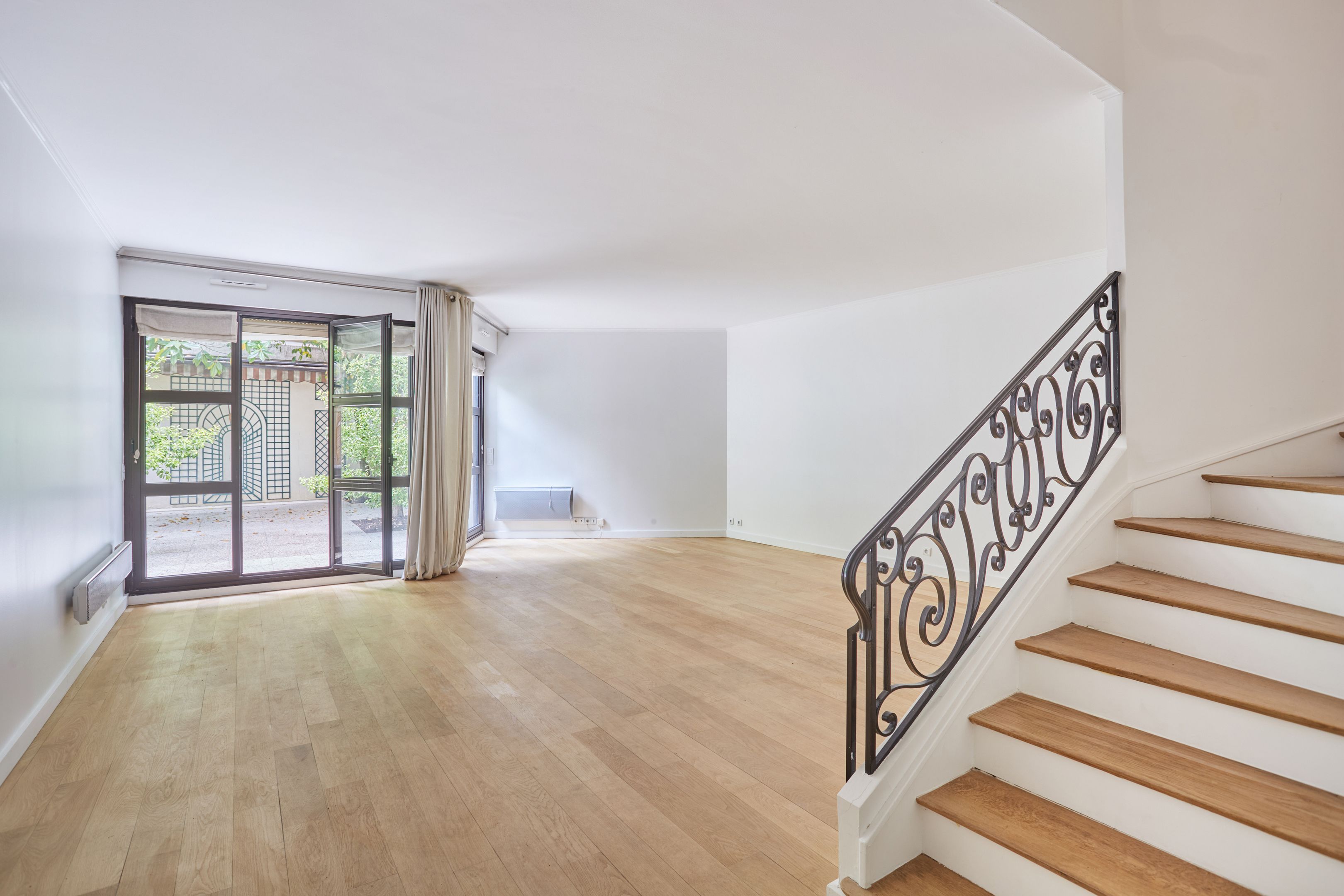 Immeuble sécurisé (digicodes, concierge, vidéosurveillance), à proximité immédiate du Bois de Boulogne, appartement non-meublé de 137,63 m² en rez-de-chaussée avec jardin privatif. Entrée, salon avec accès jardin privatif, salle à manger avec cuisine ouverte, aménagée au premier niveau. Toilettes séparées. À l'étage : trois chambres avec placards, salle de bains avec toilettes, salle de douche avec toilettes.