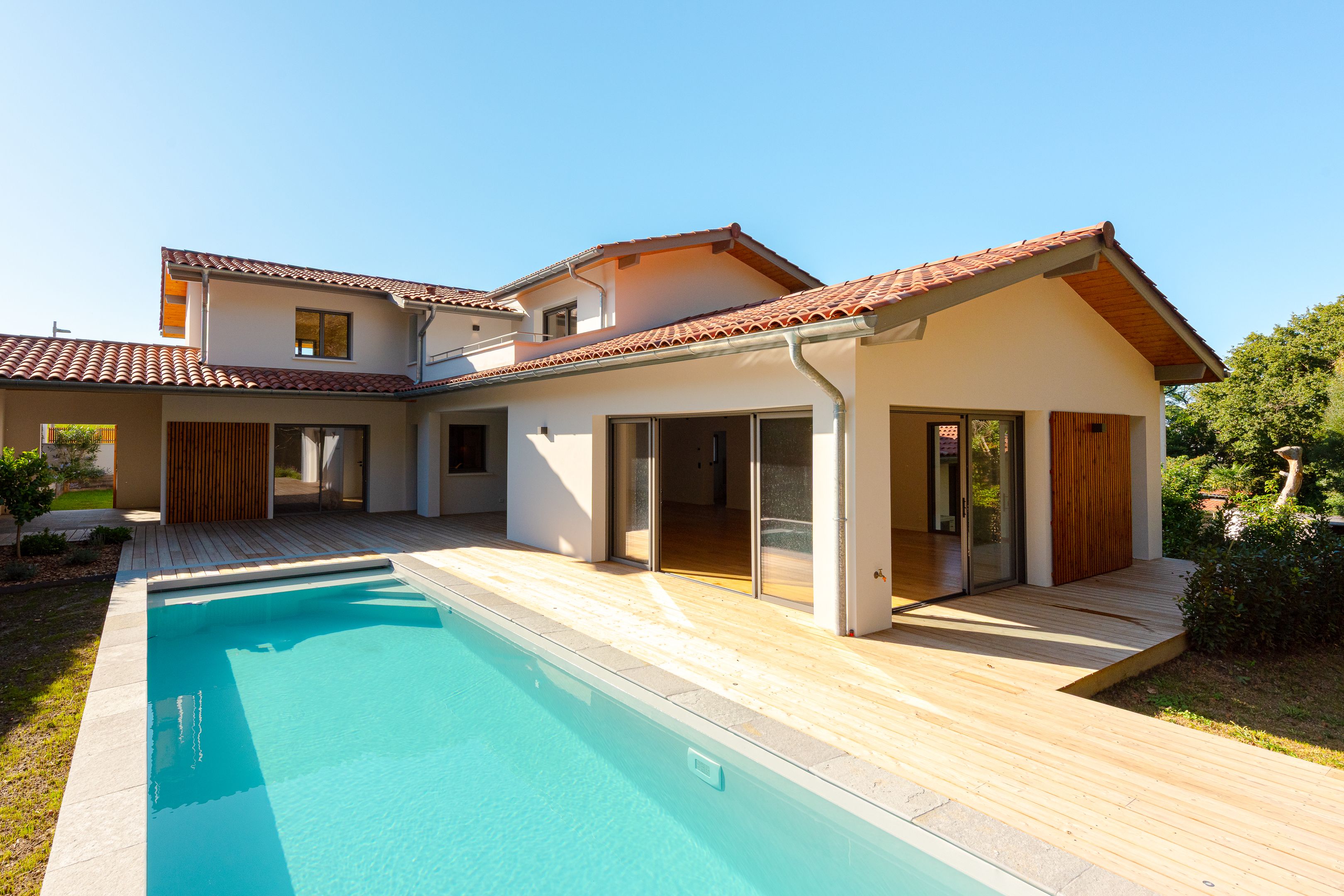 Au rez-de-chaussée, spacieuse pièce de vie s'ouvrant sur un jardin et une piscine au sel chauffée exposée sud, cuisine semi-ouverte, suite parentale dotée d'une salle de bains, vaste dressing, toilettes d'invités.