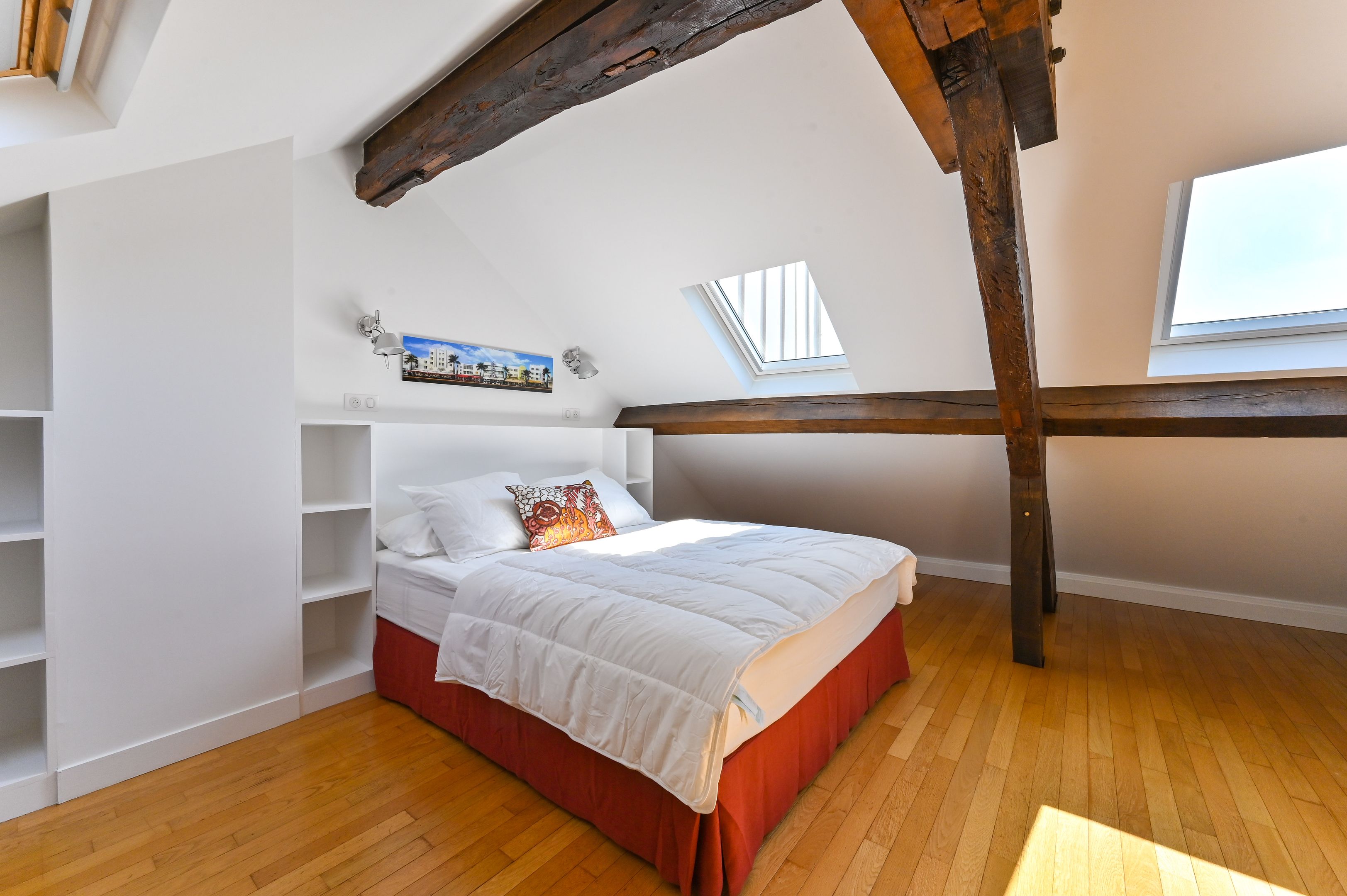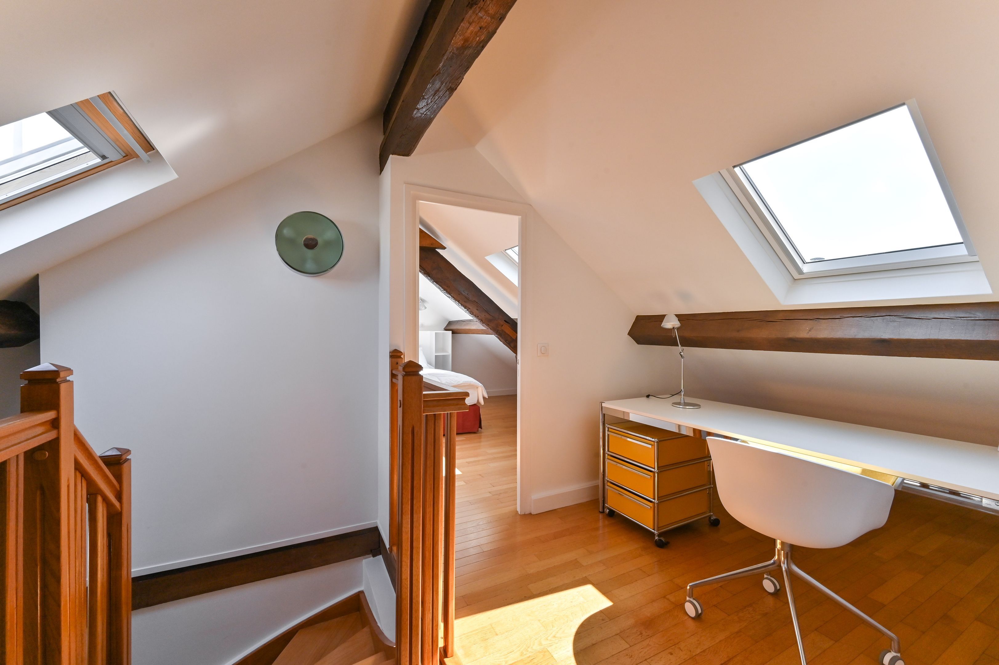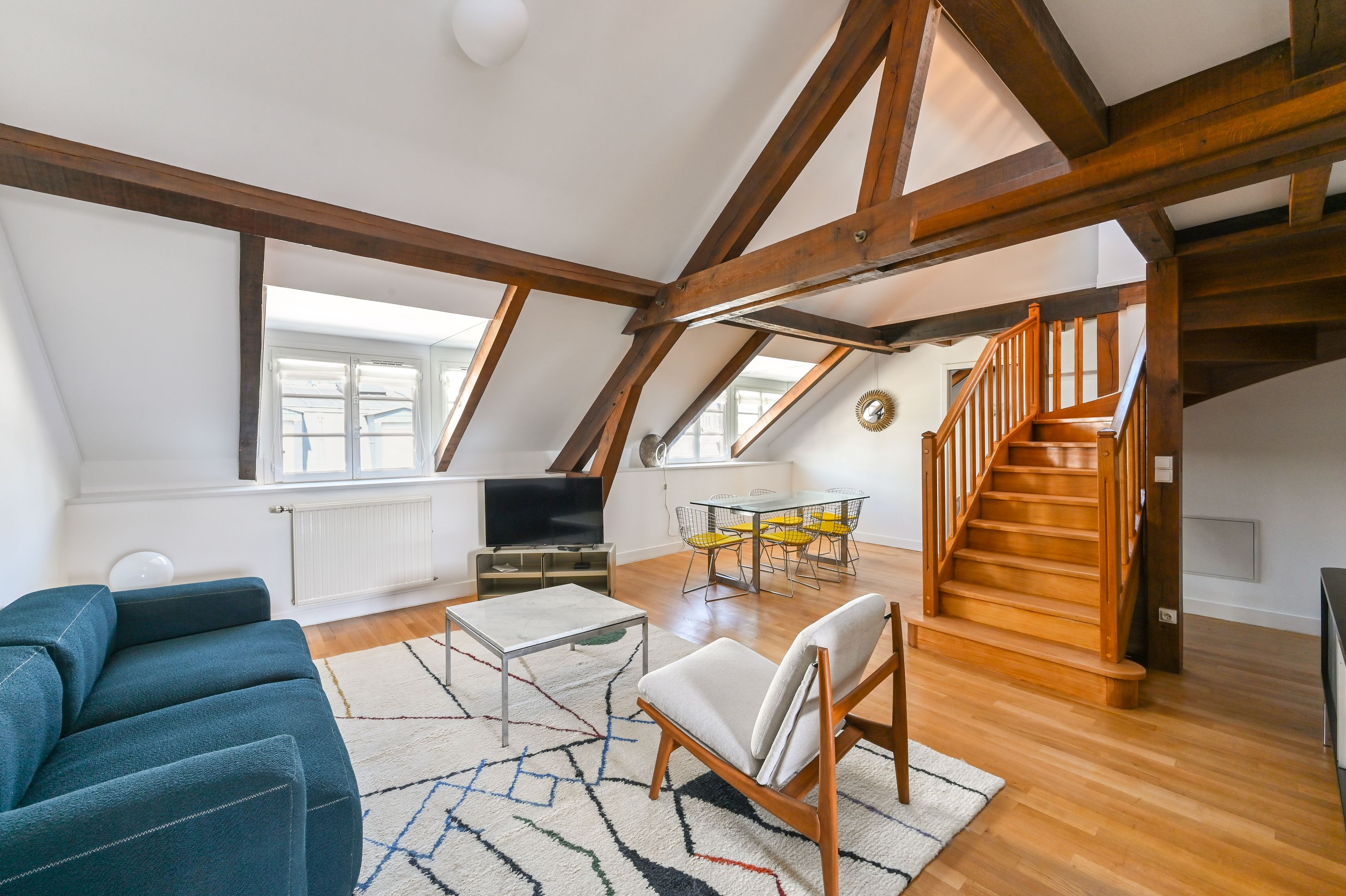 Immeuble ancien rénové, appartement de 112 m² en duplex, meublé, aux derniers étages bénéficiant de prestations et d’un cachet rares. Au premier niveau : entrée avec penderie, séjour double, cuisine aménagée et équipée, espace buanderie, chambre avec salle de douche, dégagement avec placards, chambre avec salle de bains, toilettes séparées. À l'étage supérieur : espace bureau, chambre et salle de douche avec toilettes. Climatisation individuelle.