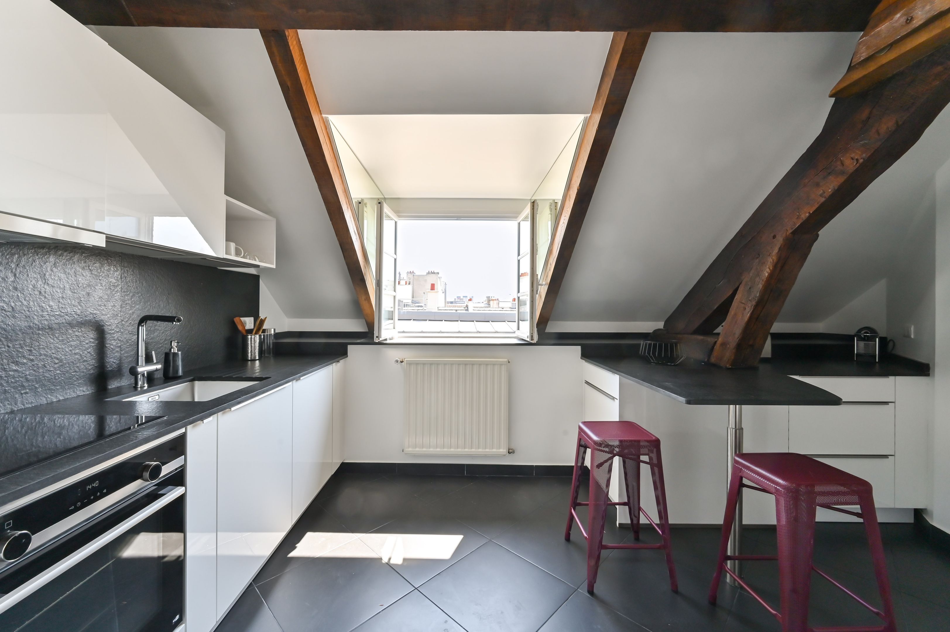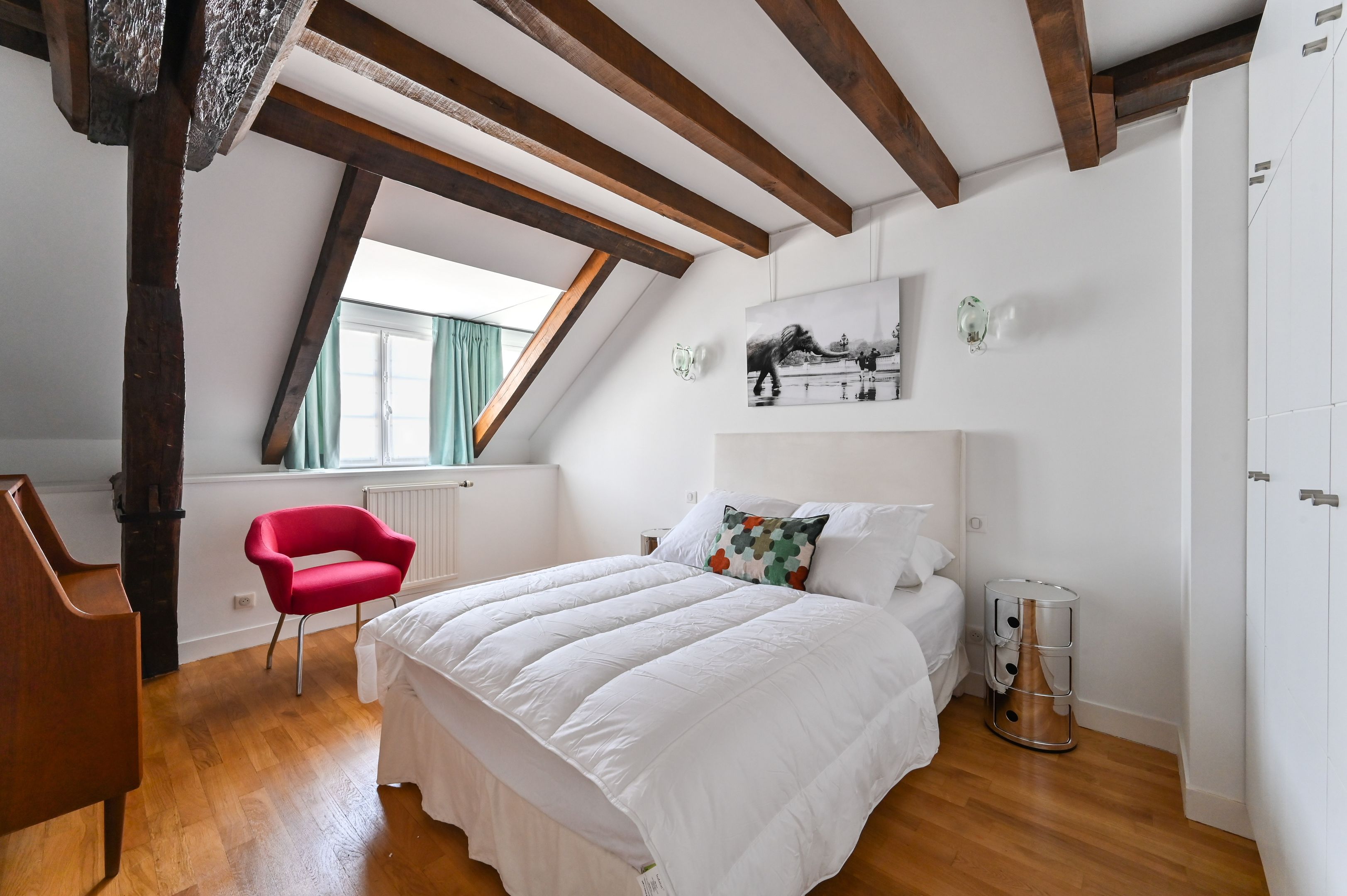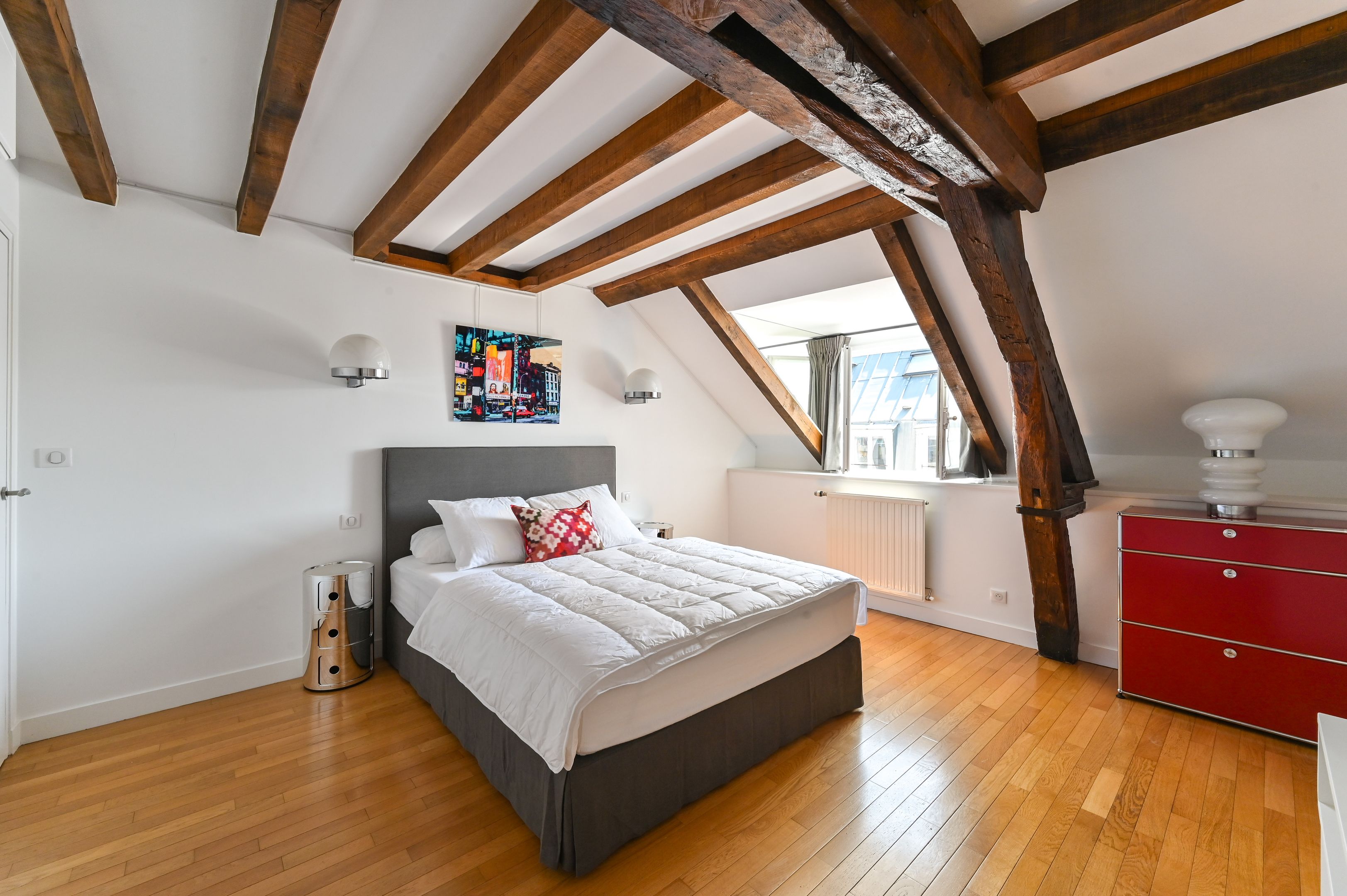 Immeuble ancien rénové, appartement de 112 m² en duplex, meublé, aux derniers étages bénéficiant de prestations et d’un cachet rares. Au premier niveau : entrée avec penderie, séjour double, cuisine aménagée et équipée, espace buanderie, chambre avec salle de douche, dégagement avec placards, chambre avec salle de bains, toilettes séparées. À l'étage supérieur : espace bureau, chambre et salle de douche avec toilettes. Climatisation individuelle.