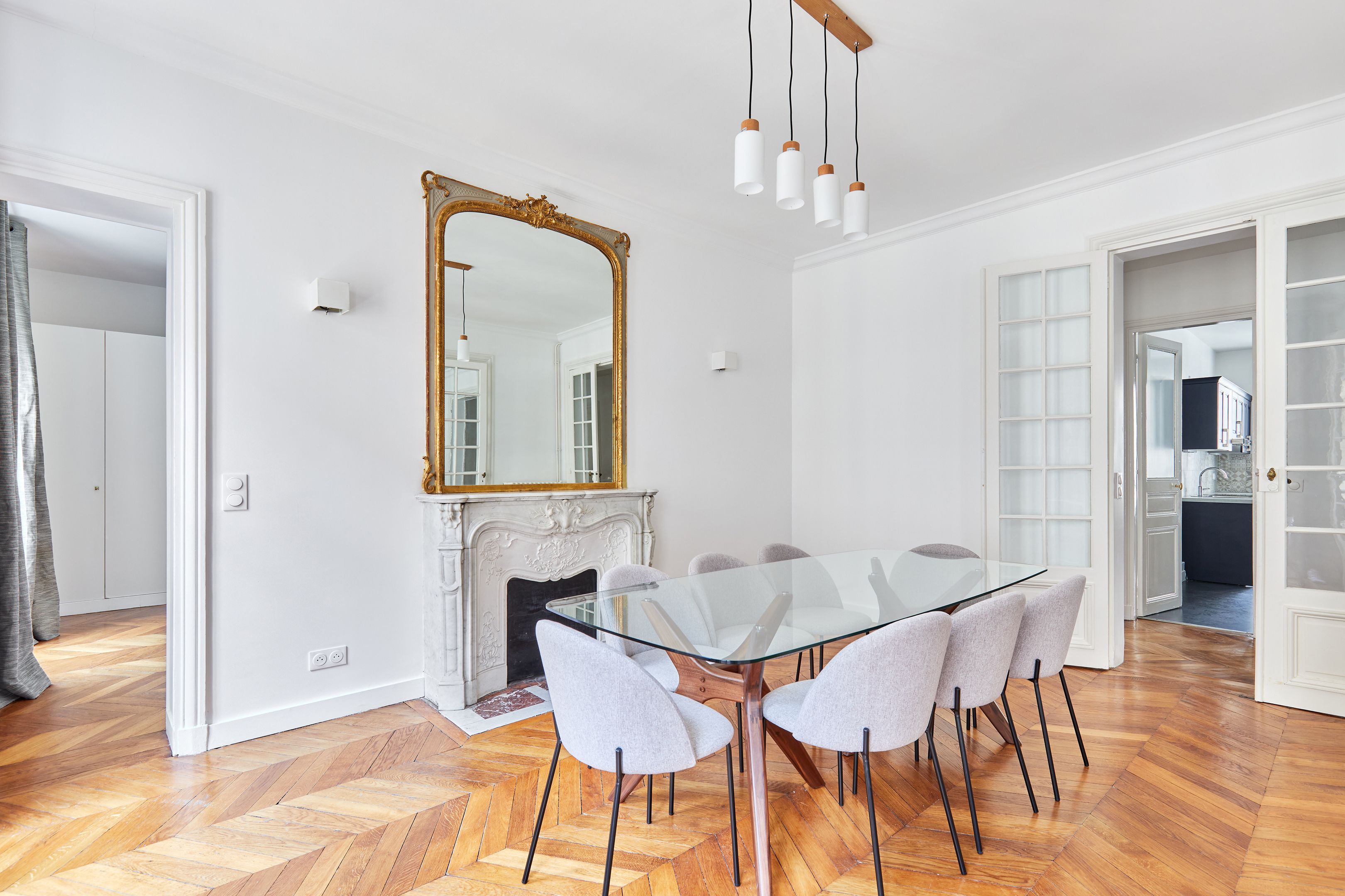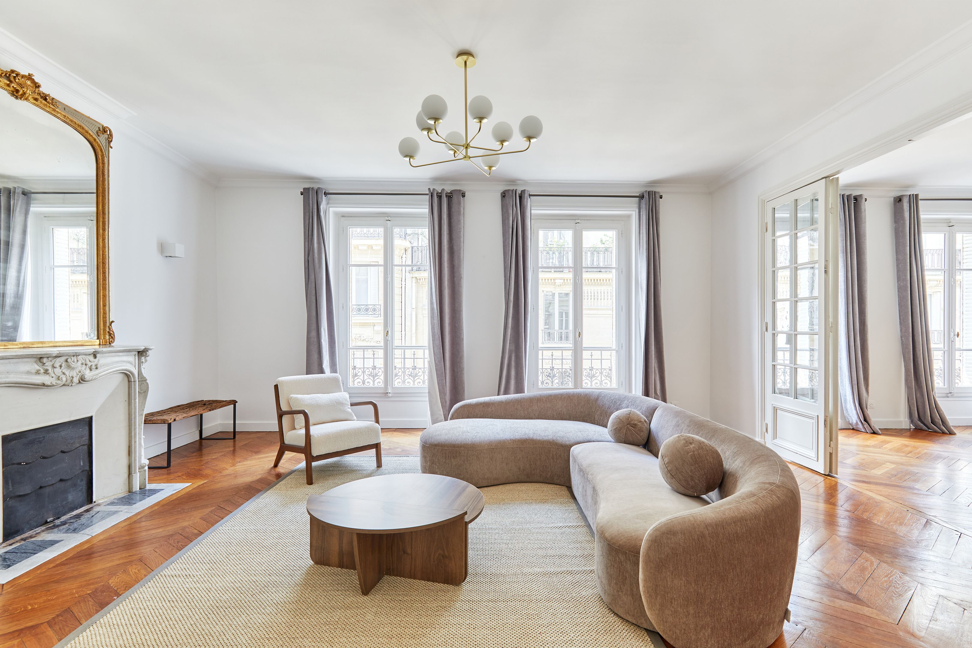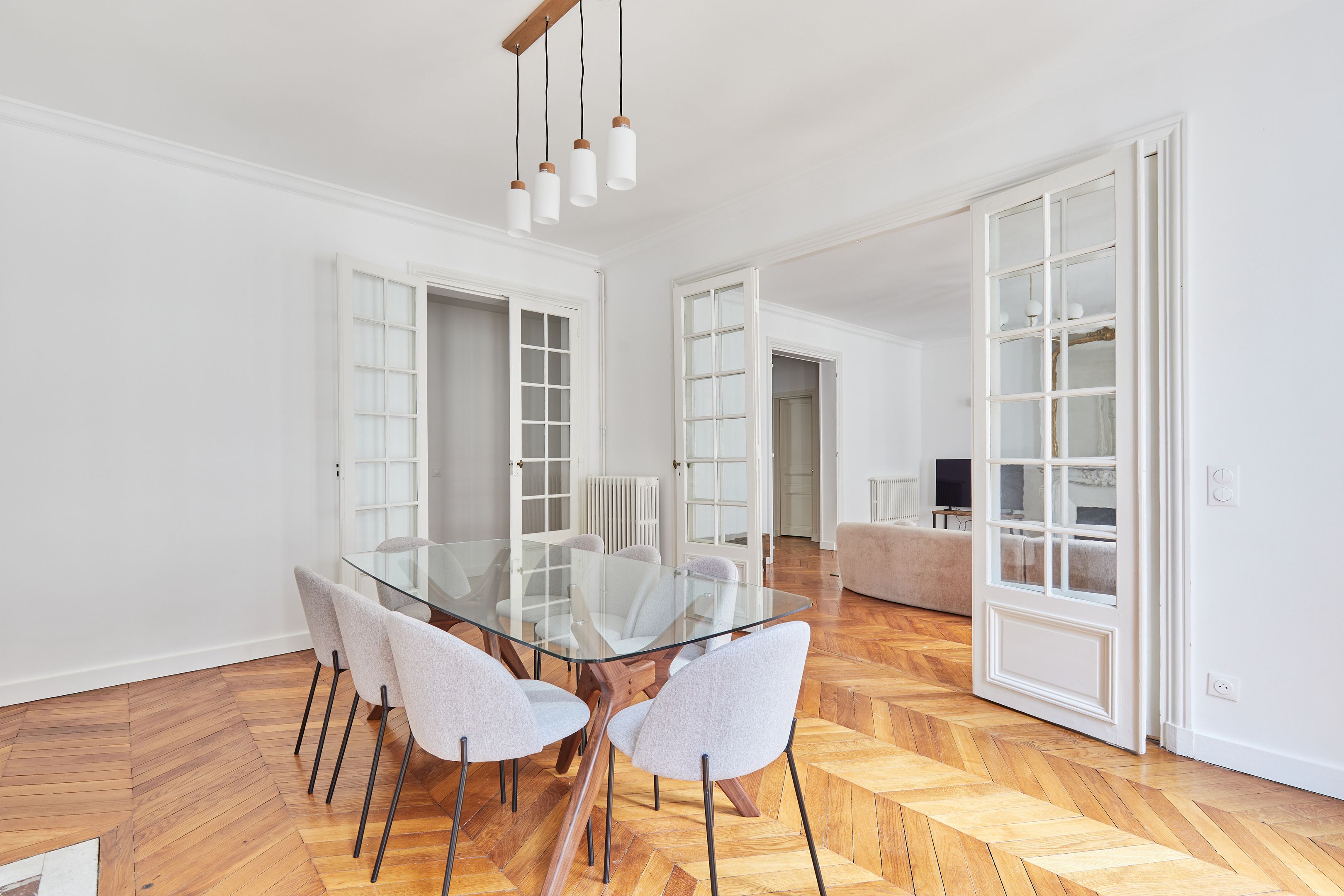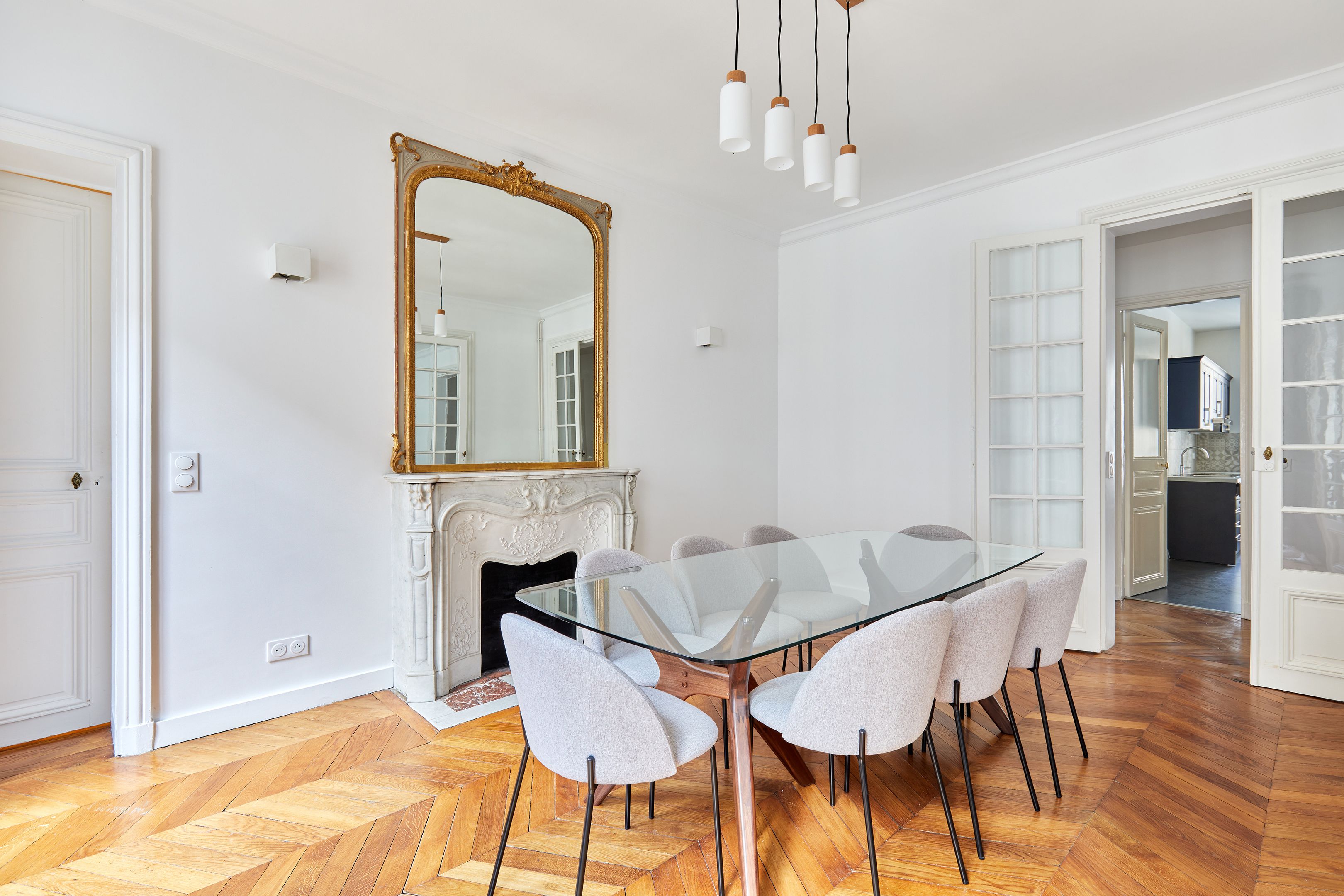 Dans un immeuble ancien parfaitement entretenu, au quatrième étage desservi par ascenseur, appartement meublé de 157,94 m², en très bon état et au mobilier neuf. Entrée, salon et salle à manger sur rue, cuisine dînatoire aménagée et équipée avec espace buanderie séparé, suite parentale (chambre avec placard et salle de bain complète : baignoire, douche, toilettes), deux chambres sur cour avec placards, salle de bains et deux toilettes séparées.