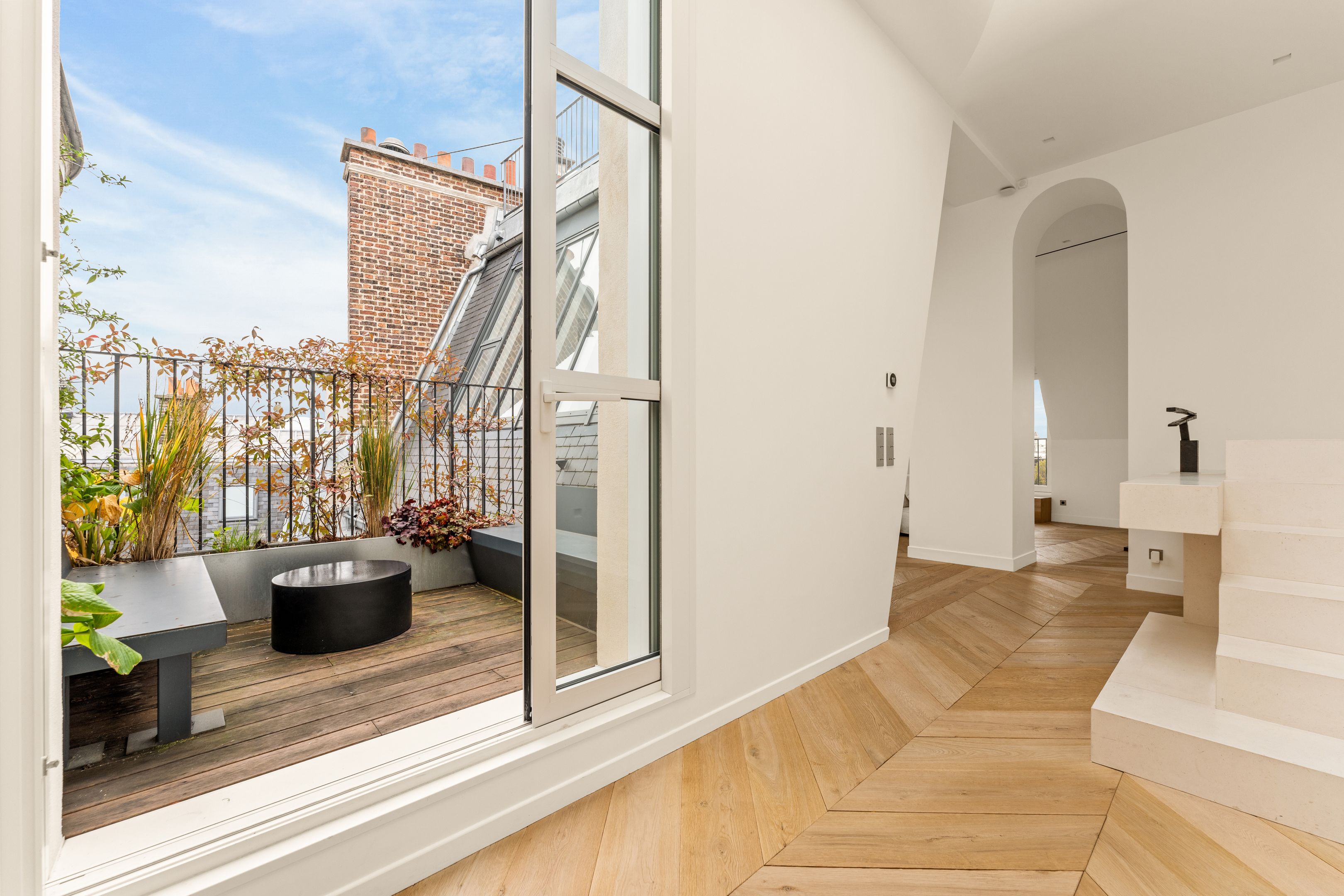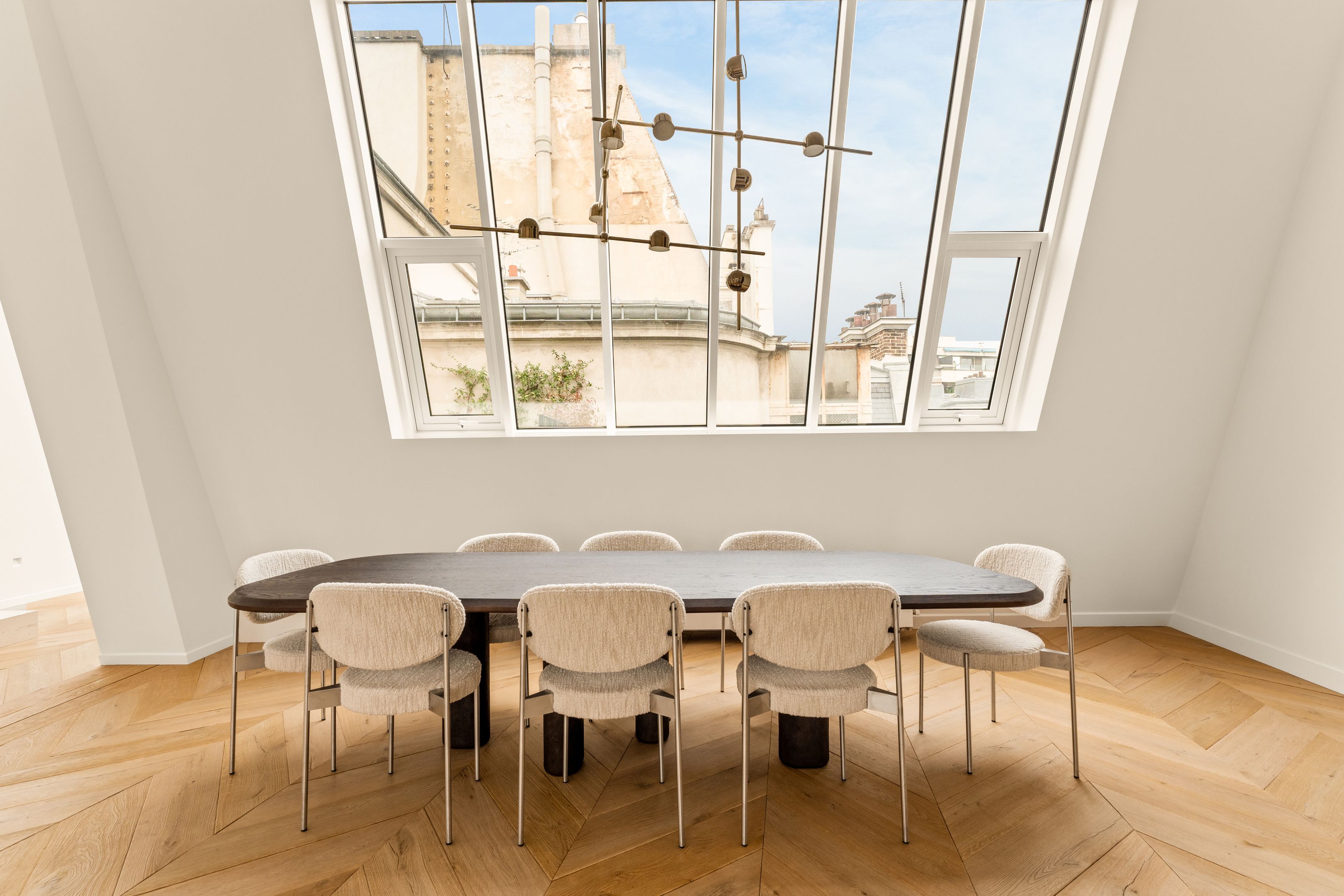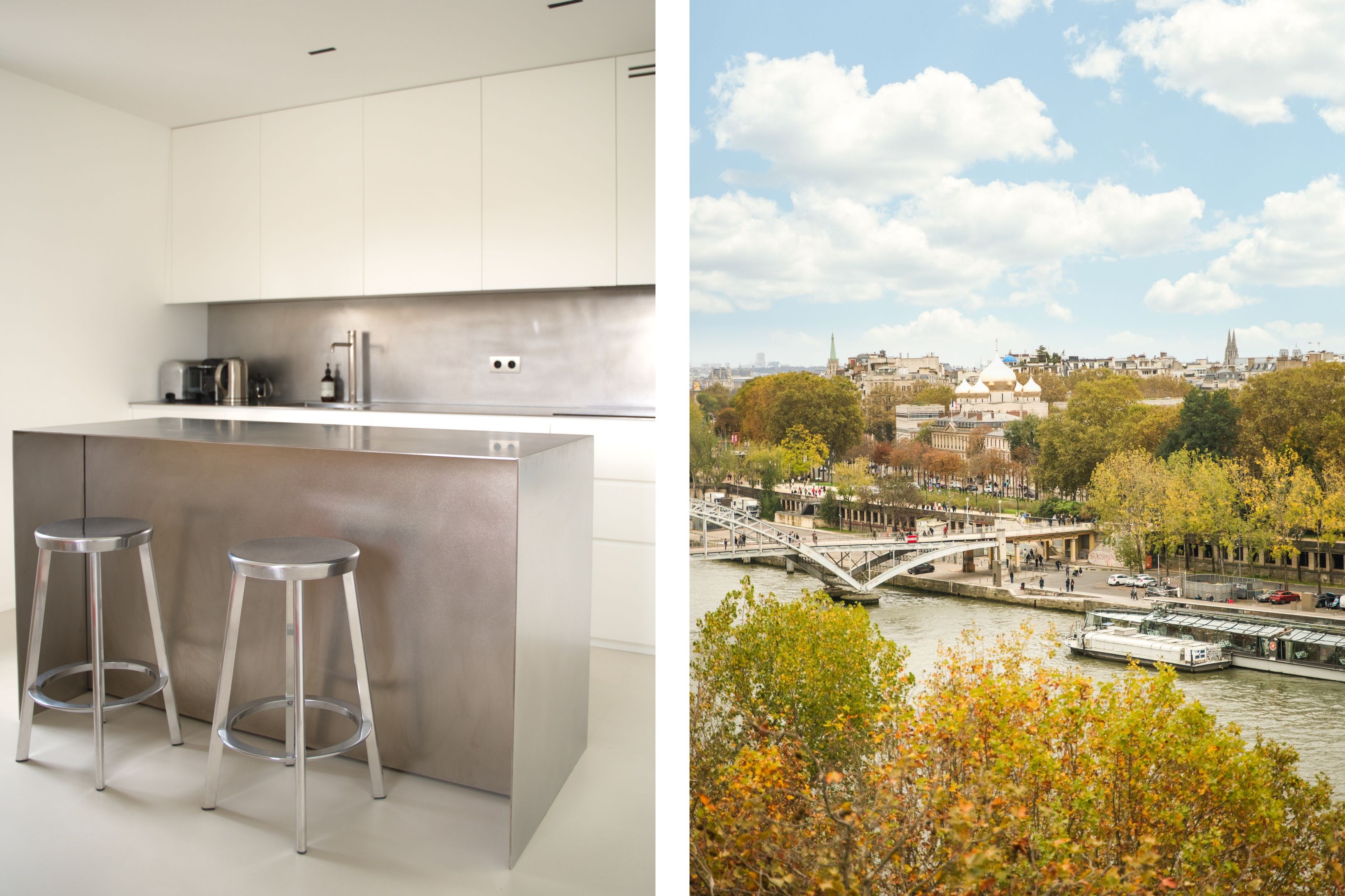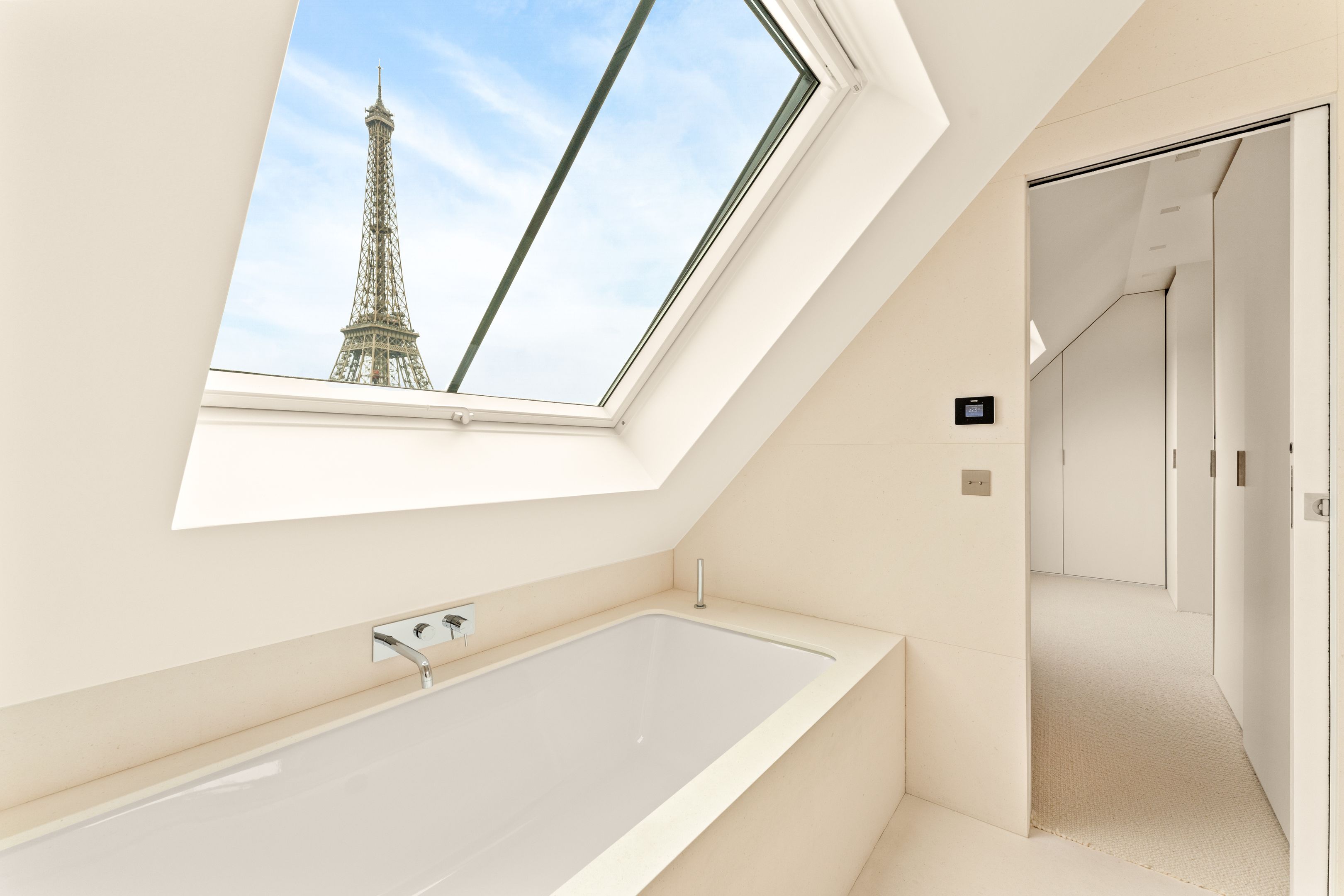 Duplex de standing offrant une vue exceptionnelle sur la Tour Eiffel depuis terrasse et rooftop. Suite parentale, chambres enfants, suite invités avec kitchenette, bureau et espace pour personnel. Climatisation et décoration design pour un confort optimal.