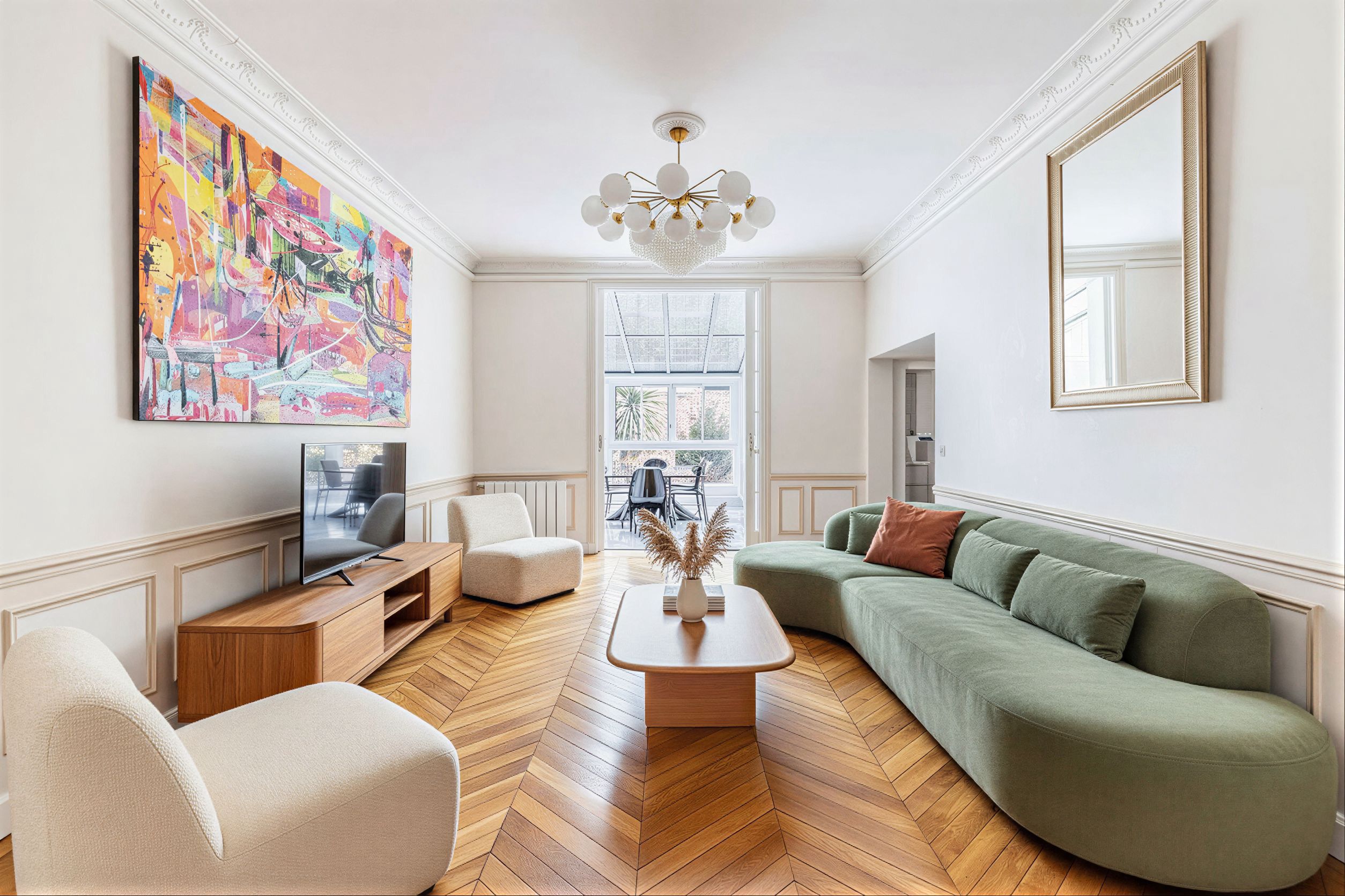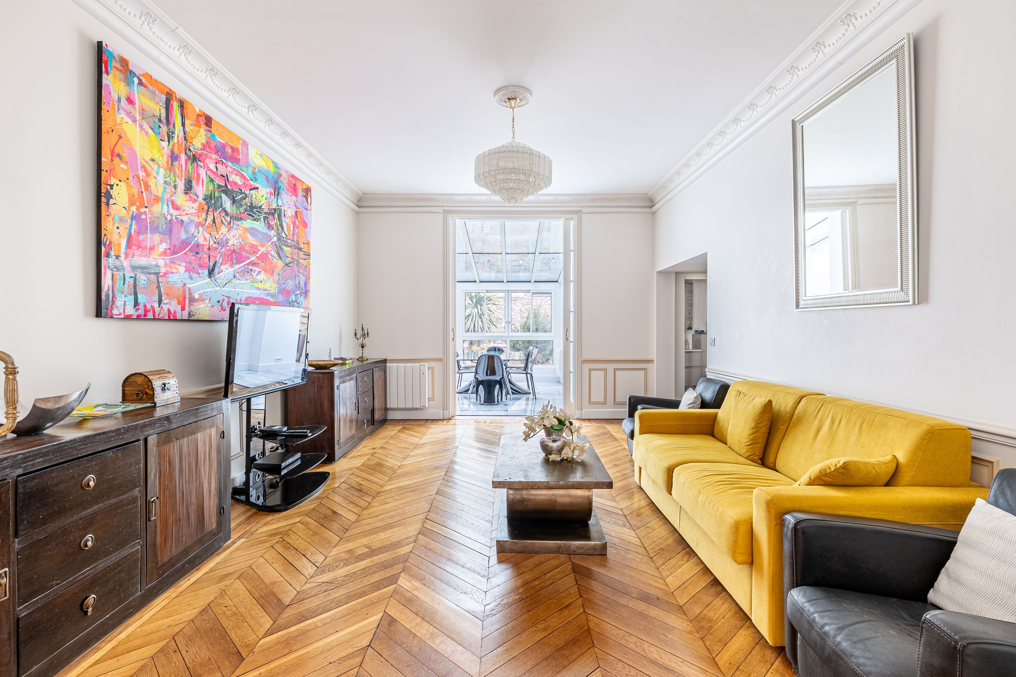 Victor Hugo - Longchamp. Idéalement situé au coeur des nombreux commerces, transports et écoles. Au rez-de-chaussée surélevé d'un superbe hôtel particulier pierre de taille fin XIXè de bon standing, très bel appartement esprit maison d'une surface pondérée de 140m² (124.09m² loi Carrez/127m² au sol + 15m² représentant un tiers du jardin de 45m²) traversant, bénéficiant d'un plan fonctionnel sans perte d'espace et du charme de l'ancien. Entrée, double réception, salle-à-manger lumineuse sous véranda offrant un accès au jardin de 45.5m², cuisine séparée aménagée, salle d'eau, toilettes. En souplex depuis un escalier, deux chambres, salle de bains, toilettes séparées, nombreux rangements.