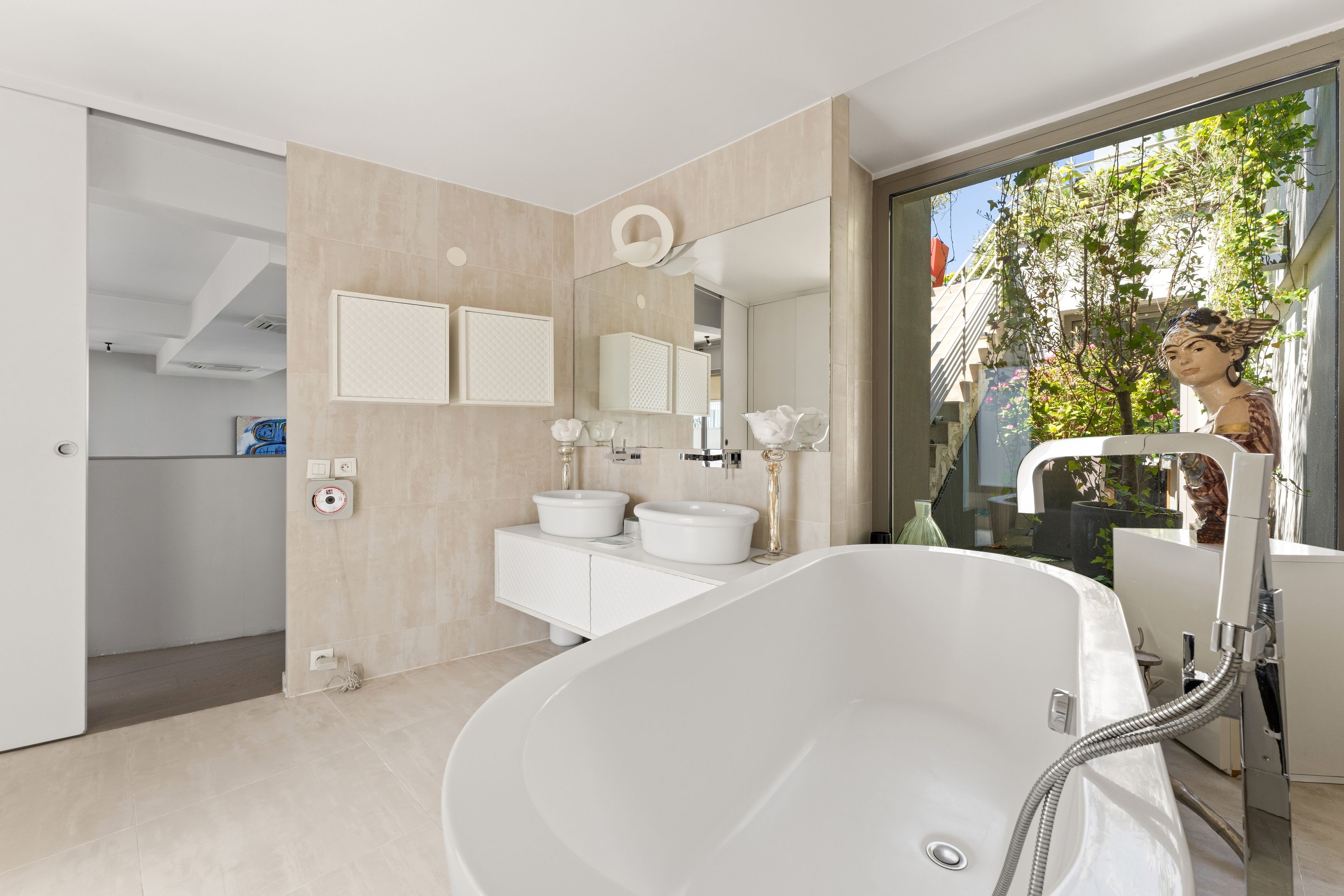 À l’étage, deux suites raffinées dont une master de 29 m² avec salle de bains, dressing et accès direct à un patio paysagé. Un escalier mène au toit-terrasse privatif : véritable jardin suspendu, idéal pour recevoir, se détendre ou simplement admirer Paris sous tous ses angles.