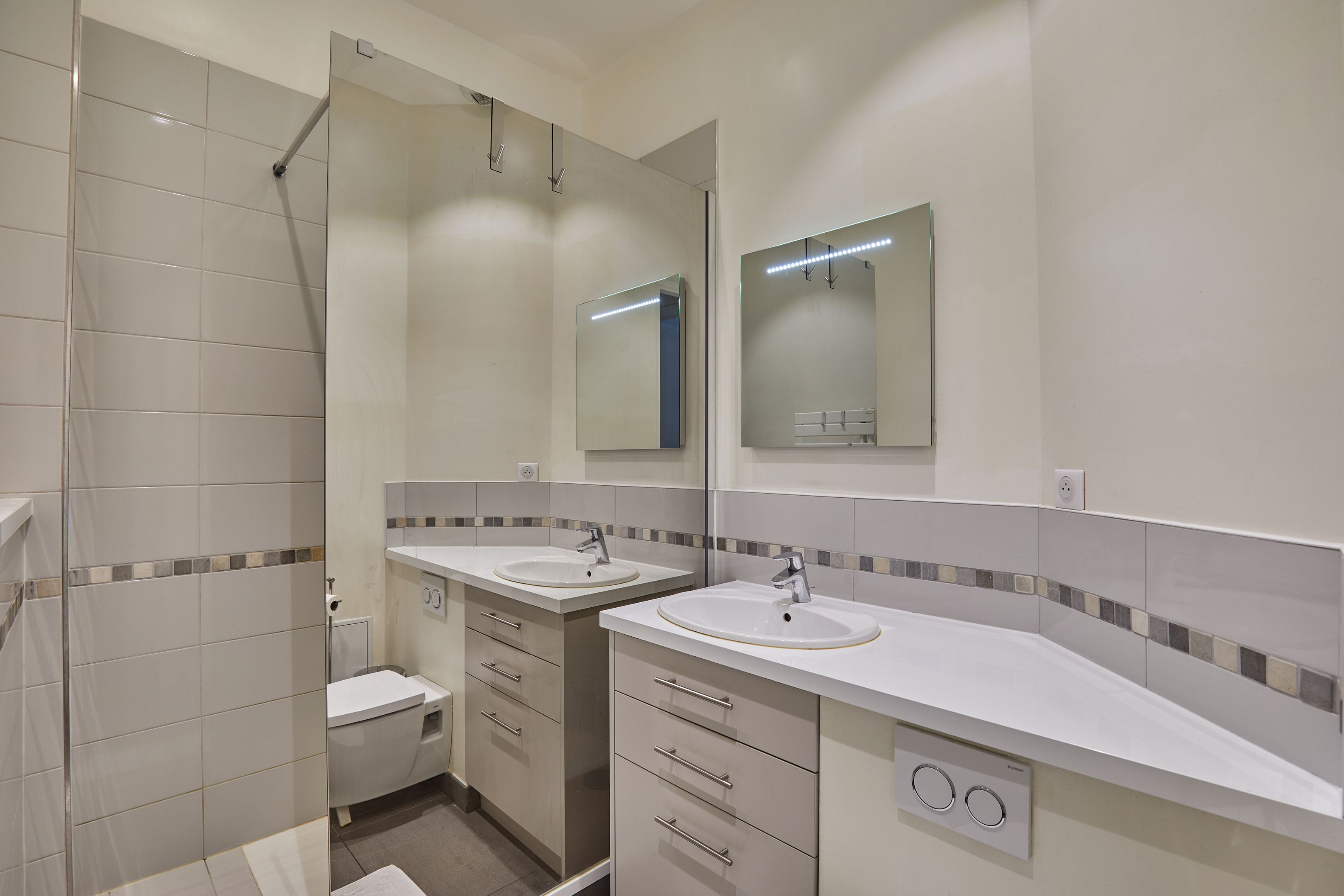 Entrée, triple-réception, très lumineuse, cuisine aménagée et équipée, chambre avec salle d'eau et toilettes, trois chambres, une salle de bains avec toilettes, une salle d'eau avec toilettes.