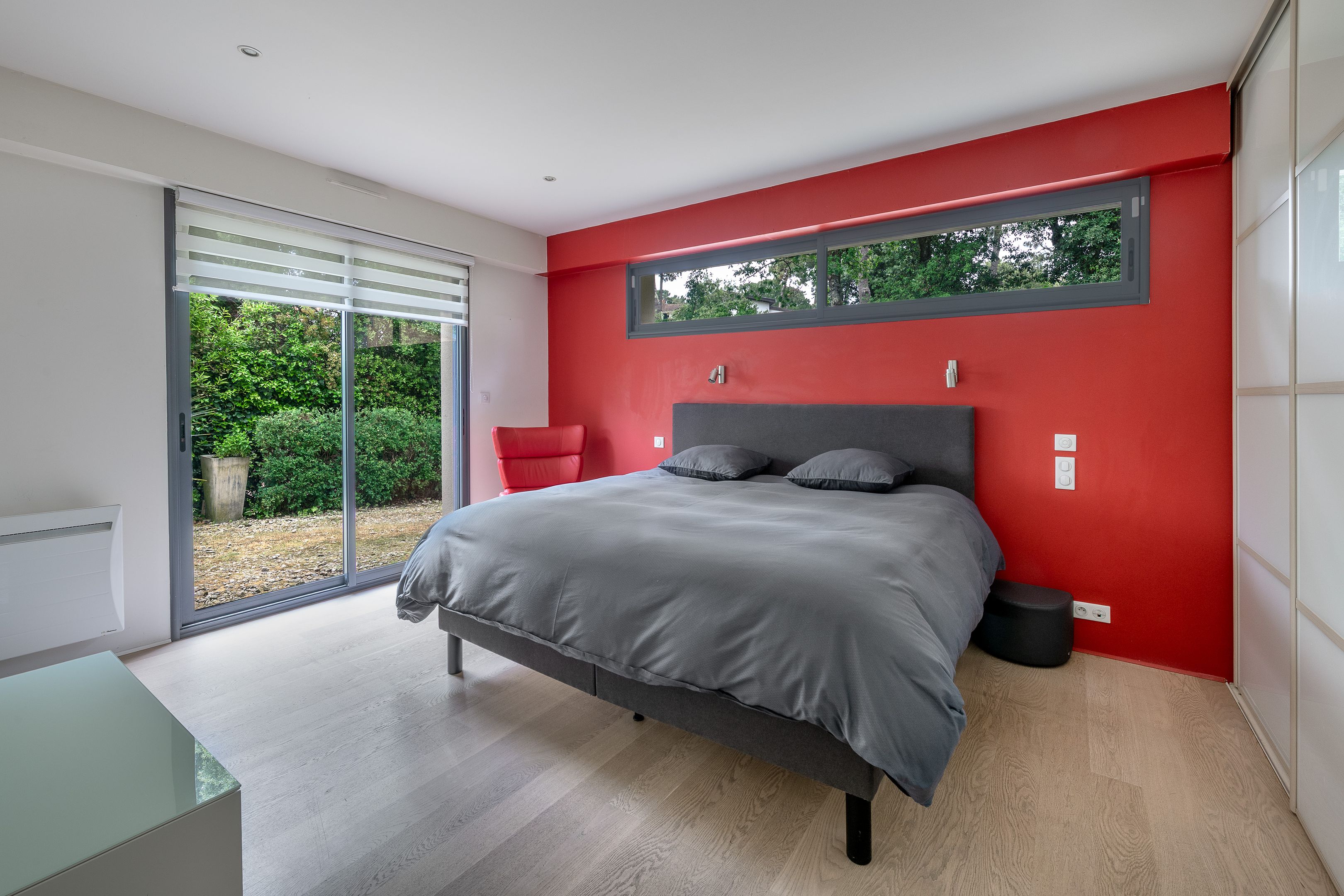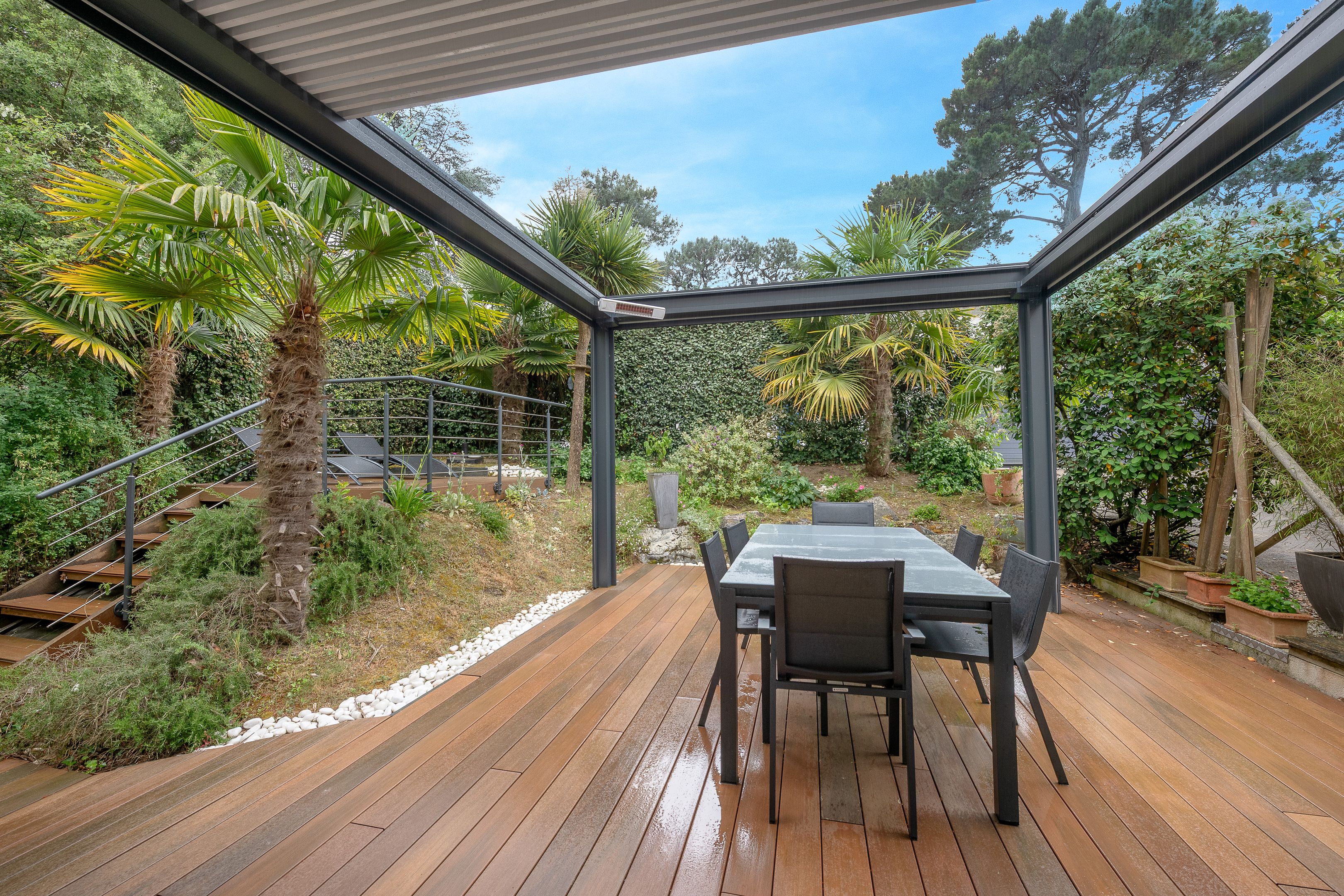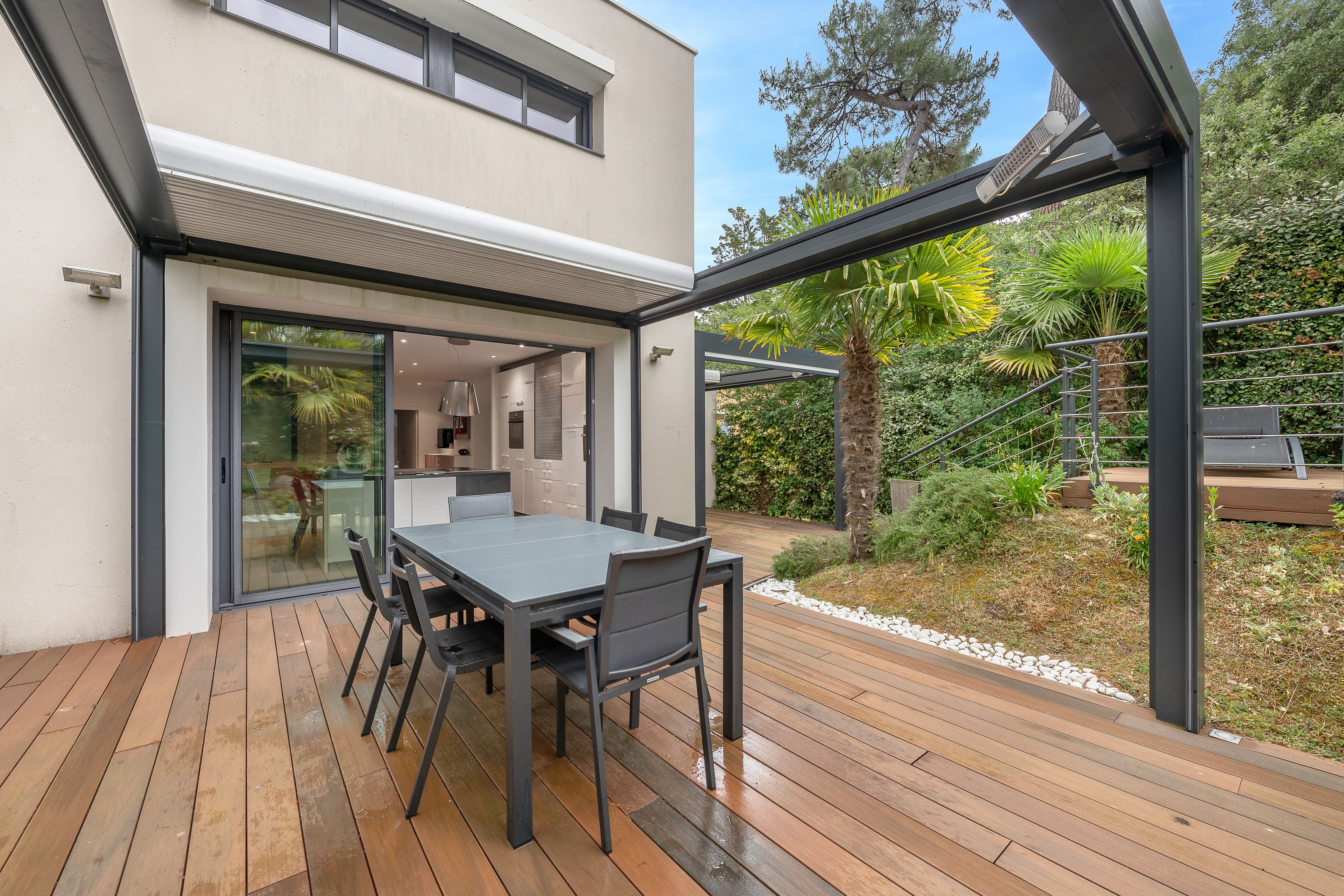 À proximité immédiate de l'avenue Lajarrige et à quelques minutes à pied de la plage, belle villa contemporaine de 2011 au calme édifiée sur une parcelle de 680m² (piscine envisageable). Au rez de chaussée : entrée, salon doté d'une cheminée donnant sur deux terrasses dotées de pergolas bioclimatiques,