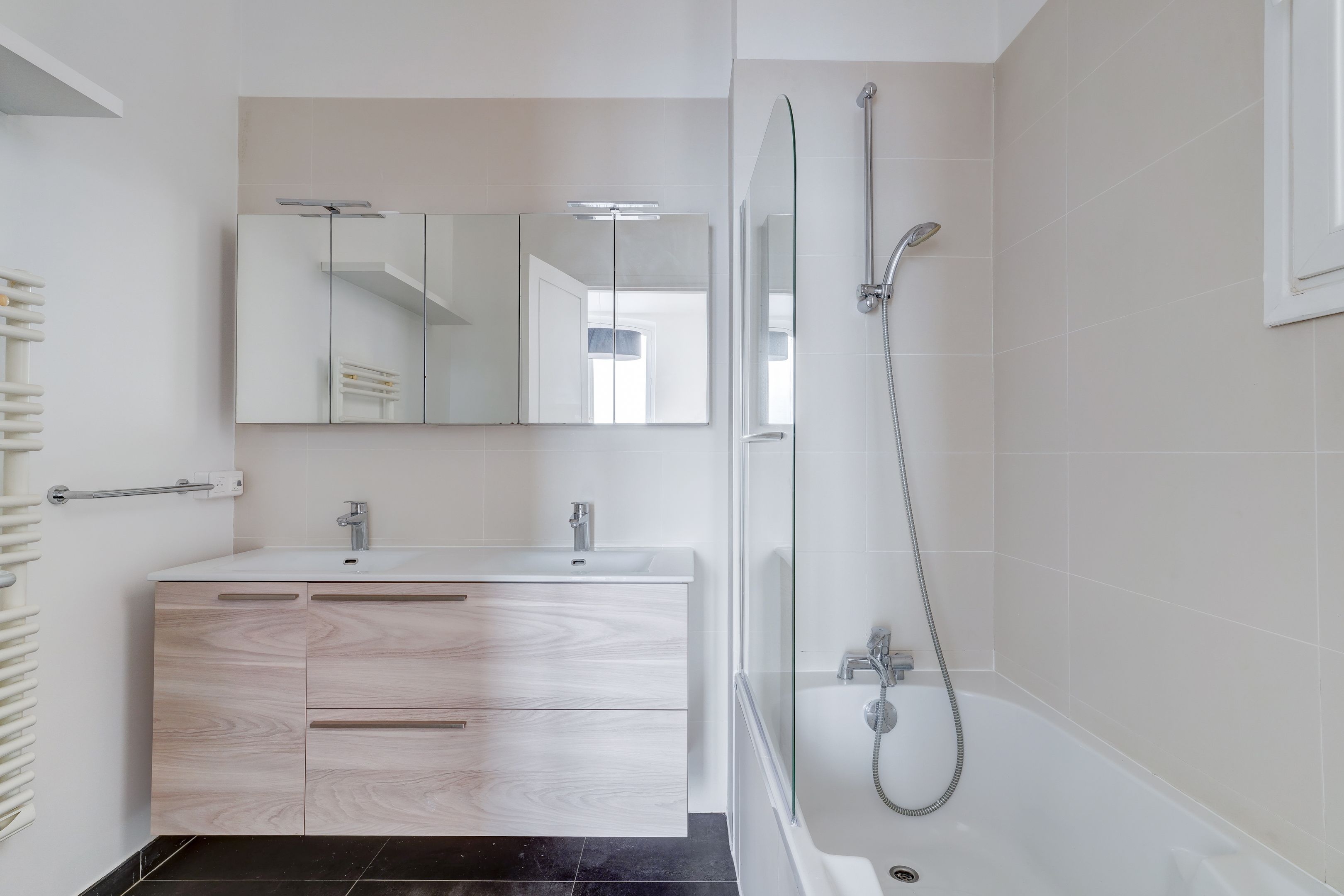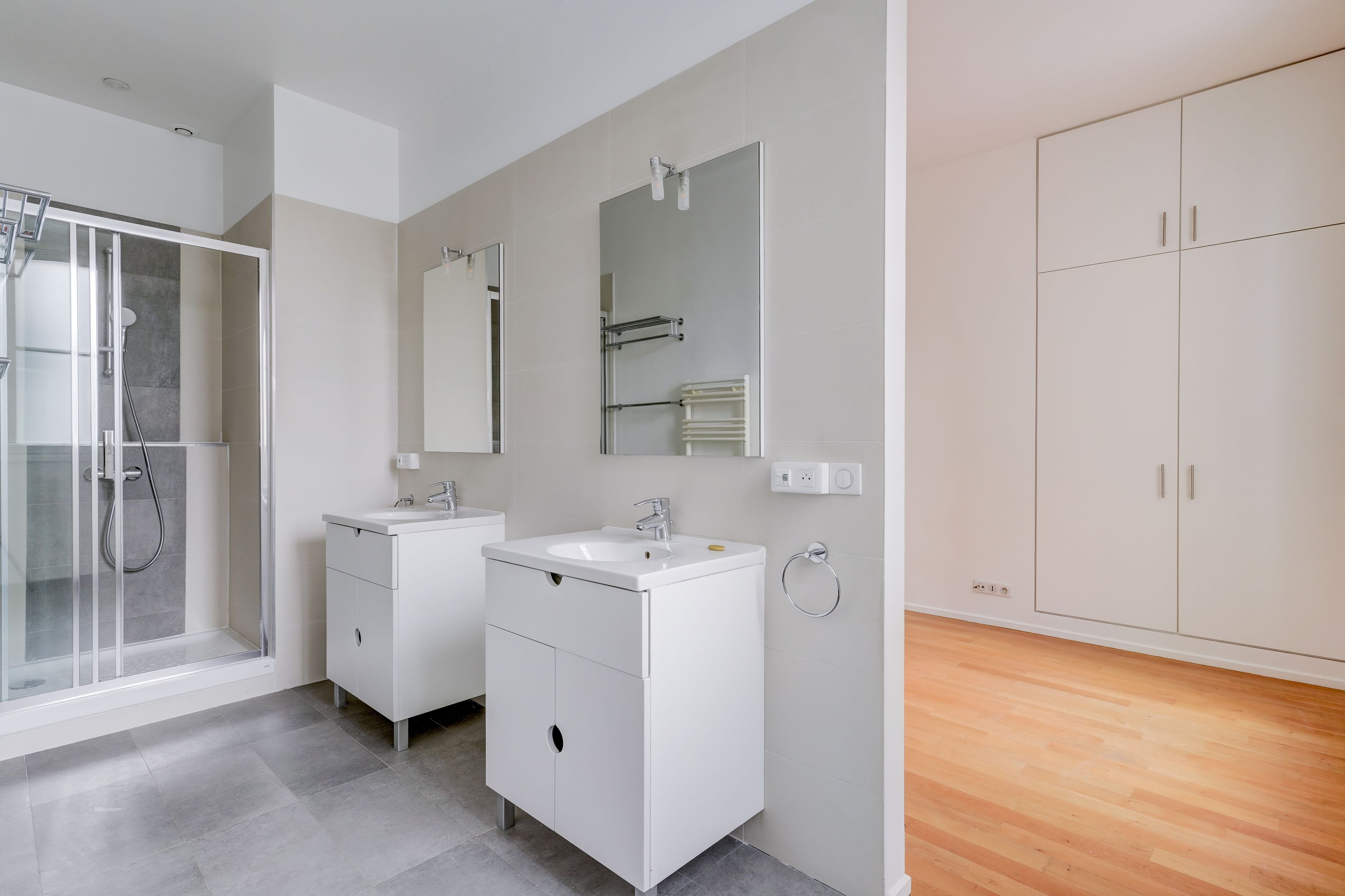 Entrée, salon et salle à manger sur rue, cuisine dînatoire aménagée, bureau, chambre avec salle de bains et toilettes, chambre avec salle d'eau, deux chambres partageant une salle de bains avec toilettes, buanderie, toilettes séparées.